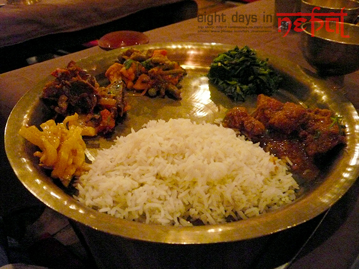 ใช้เวลาไปจนเต็มอิ่มก็กลับมาพบอารบินที่ทางเข้า เย็นนี้เรามีโปรแกรมอาหารเย็นแบบเนปาลีเซ็ต พร้อมชมการแสดง พวกเราไปถึงร้านเป็นกลุ่มแรกบ๋อยชาวเนปาลยังจัดที่ไม่เสร็จเลย ร้านออกสลัวถึงมืด เวลากินอาหารต้องเพ่งกันเล็กน้อย เริ่มต้นที่เหล้าท้องถิ่นของเนปาล ที่ใช้เหยือกยกเทเป็นสายยาวเสียวกระฉอกหก จิบแล้วไม่ไหวขอถอยเพราะแรงเหลือเกิน อาหารเนปาลถูกยกออกมาตักเสิร์ฟในจานทองเหลืองใบใหญ่ของแต่ละคน อารมณ์ประมาณข้าวแกงแต่มีกับหลายอย่าง มีไก่มีหมูมีผักเป็นส่วนใหญ่