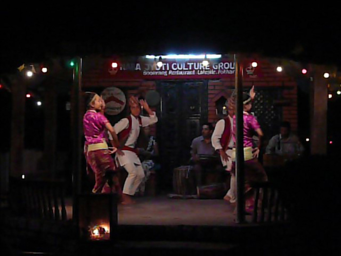 สักพักดนตรีก็เริ่มบรรเลง นี่เป็นครั้งแรกที่ได้ยินเพลง resham firiri ซึ่งต่อไปจะได้ยินแทบทุกวัน จากนั้นก็มีการแสดง นักเต้นก็วิ่งเต้นไปทั่วร้าน เด็กเสิร์ฟก็เดินเสิร์ฟไป คนเก็บโต๊ะก็เก็บไป เดินกันวุ่นวายทั่วร้านแปลกดี ดูๆไปไฟก็ดับ พรึ่บ!! เฮ อารบินบอกว่า เดี๋ยวเขาก็ปั่นไฟ ตอนนี้คงเป็นเวลาไฟดับย่านนี้ อืมม จริง สักพักไฟก็มา ดูไป 2-3 ชุดก็ไม่ไหวแล้วขอกลับไปนอนพักผ่อนดีกว่า นมัสเต