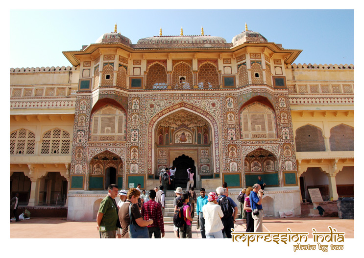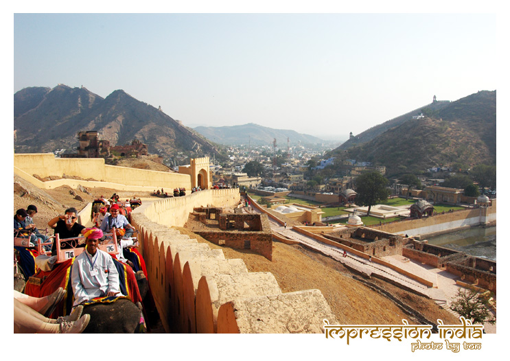 วันนี้คุณหนึ่งอนุญาตให้เด็กๆตื่นสายได้อีกครึ่งชั่วโมง เป็น 6.30-7.30-8.30 เพราะเราไม่ต้องเดินทางไปไหน เที่ยวมันแต่ในชัยปุระนี่แหละ เช้าวันนี้ฟ้าให้อภัยเรา เปิดสีฟ้าให้เห็นแล้ว แต่ก็ต้องแลกกับแสงแดดที่ร้อนแสบตัวพอควร แม้ลมจะเย็นแต่แดดแรงเข้าขั้นทีเดียว พอกครีมกันแล้วเตรียมตัวไป แอมเบอร์ฟอร์ท (Amber fort) เปิดโพยของ GTT อ่านดูหน่อย “แอมเบอร์ฟอร์ทหรือป้อมปราการแห่งเมืองชัยปุระ สร้างขึ้นโดยมหาราชาแมนสิงห์ ในปี ค.ศ. 1592 และเสร็จสิ้นลงในสมัยของมหาราชาใจสิงห์ เป็นป้อมปราการเด่นตระหง่านอยู่บนเนินเขา สร้างด้วยสถาปัตยกรรมแบบราชปุต ริมเชิงหน้าผามีทะเลสาบซึ่งสะท้อนภาพของป้อมปราการแห่งนี้ให้เป็นทัศนียภาพที่น่าชมยิ่งนัก” วันนี้เราได้นั่งช้างขึ้นไปบนป้อม แขกให้พวกเรานั่งข้างเหมือนผู้หญิงซ้อนมอเตอร์ไซค์ ไม่ยักนั่งหันหน้าแบบช้างไทย แต่ก็ดี เพราะถ่ายภาพทิวทัศน์ได้แจ่ม ไม่ต้องเอี้ยวตัว สมาชิกในกลุ่มทุกคนรู้หน้าที่กันดี โดยไม่ต้องเอ่ยปาก ต่างผลัดกันยกกล้องมาถ่ายกันไปมา ยังกับยิงต่อสู้ ต่างฝ่ายต่างหวังว่าจะได้รูปบนหลังช้างกันบ้าง ..เราถ่ายไว้ครบทุกคู่ ว่าจะไปอัดลงจานเอามาขายหาทุนเที่ยวทริปหน้า ฮ่าๆๆๆ