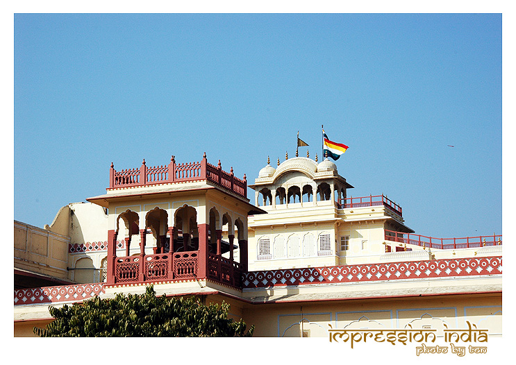 กลับเข้าโรงแรมพักกินอาหารกลางวัน บุฟเฟ่ต์อาหารแขกเหมือนเดิม แจมด้วยสปาเก็ตตี้กับไก่ทอด พออิ่มๆออกไปลุยต่อ ตอนเช้านั่งรถผ่านย่านเมืองชัยปุระไปแล้วครั้งหนึ่ง ตึกสองข้างทางสมัยสร้างเมืองเป็นอาคารที่สวยมากๆ แม้จะกลายเป็นร้านขายของหมดแต่รูปทรงอาคารก็สวยเป็นระเบียบตลอดแนว กระโดดเบาะซ้ายเบาะขวาเหมือนเดิม ถ่ายรูปไม่ได้ดีนัก แต่บ่ายนี้เราจะเข้าไปเที่ยว พระราชวังชัยปุระ (Jaipur city palace) ซึ่งอยู่กลางย่านนั้นเลย ลงรถในลานจอดแล้วเดินเข้าไปชมพระราชวังเก่า ซึ่งเปิดให้เข้าชมบางส่วน และเปิดอาคารเป็นพิพิธภัณฑ์ด้วยส่วนหนึ่ง ปัจจุบันทายาทของมหาราชาตระกูลซิงค์ก็ยังอยู่ในบริเวณนั้น (แบ่งสัดส่วนไว้ชัดเจนชื่อ Moon palace) เปิดบางส่วนเก็บเงินเป็นรายได้แบ่งกับรัฐบาลสบายไป ด้านในมีลานกว้าง มีอาคารต่างๆเยอะแยะ เราไม่ได้เดินทั่วทั้งหมด เอาแค่พอได้สัมผัสสมบัติมหาราชา แล้วก็ออกมา