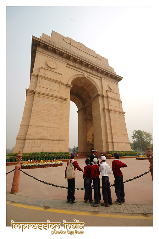 วนรถให้ดูน้ำลายย้อยได้ 2 รอบ ก็วนไปจอดด้านหลัง ประตูเมืองอินเดีย (India gate) หน้าตาเป็นแบบยุโรปมากๆ จำได้ว่าประเทศที่เคยโดนพวกยุโรปเข้าครอบครองมักมีประตูลักษณะนี้หราอยู่กลางเมือง เช่นเวียงจันทน์ อินเดียก็เคยโดนอังกฤษเข้ามาควบคุมครอบครองอยู่พักหนึ่งเหมือนกัน แต่ประตูอินเดียมันไปเหมือนประตูชัยที่ปารีสซะงั้น…. ลงไปเดินชมกันพักใหญ่ เจอเด็กนักเรียนมาทัศนศึกษากันเยอะมาก เด็กๆอินเดียน่ารักนะ กล้าด้วย ชี้ชวนให้ถ่ายรูปตลอด ไม่มีหลบ ไม่มีอาย โดยเฉพาะพวกเด็กผู้ชายยื่นหน้ามาเข้าแทบชนกล้องกันเลยทีเดียวเชียว…