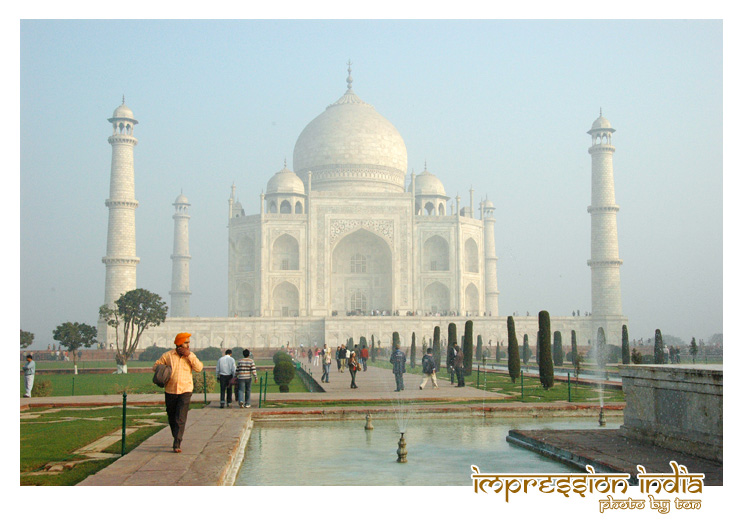 เดินเข้ามาผ่านซุ้มประตูอิฐแดงแรก ก็มองเห็นทัชจางๆรางๆผ่านม่านหมอก….ยังถอนหายใจอยู่ ขาวไปหมด คนก็เยอะ หามุมถ่ายภาพยากมากๆ ก็เดินชักภาพไปเรื่อยๆ มีแขกดอยอยู่เป็นระยะๆคอยหลอกชี้จุดถ่ายภาพให้นักท่องเที่ยว…อีนี่จุดนี้แบบสวยสุดๆนะนาย…อีนี่ก้มดูที่น้ำซิมี reflection นะนายจ๋า….อี่นี่แขกจะพาไปดูมุมถ่ายภาพเจ๋งๆอีกนะนายจ๋า…ใครหลงกลพวกแขกดอยนี้ก็จะโดนเรียกเก็บเงินค่าบอกจุดในภายหลัง อย่าหวังมาหลอกคนไทย (จนๆ) อย่างเราเลย ไหนๆเอ็งชี้ตรงไหน เออ…จำไว้เดี๋ยวเดินมาดูเองทีหลัง ปล่อยแหม่มมันโดนหลอกไป…ฮ่าๆๆๆ มาหลอกอะไรกันวันนี้ ฟ้าปิดขนาดนี้ reflection อะไรกัน มองแทบไม่เห็น