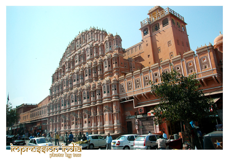 พวกเราเดินตามดร.อาเจ๊ดเพื่อไปเข้าพระราชวังแห่งสายลมด้านหลัง ใครจะไปรู้ฟะว่าเข้าด้านหลัง เดินเข้าไปแล้วไต่ทางลาดขึ้นชั้นบนไปเรื่อยๆ โผล่หน้าชมเมืองแสร้งว่าเป็นอีหนูมหาราชากันครึกครื้น วิวด้านบนมองลงมาเห็นตึกตามแนวถนนที่สร้างด้วยหินทรายสีส้มแดงแล้วแกล้งถาม อาเจ๊ดว่า “where is pink city?” อาเจ๊ดชี้ไปที่เมืองบอกว่า “here!!” เราทำคิ้วขมวดพร้อมขึ้นเสียงสูงถามกลับว่า “where?” พร้อมส่ายหัวแสดงความไม่เห็นด้วย “It’s not pink. It’s orange.” อาเจ๊ดกรอกตาส่ายหัวด็อกแด็กพร้อมตอบแบบเลี่ยงๆว่า ก็ไม่เชิงชมพูหวานแหววหรอกจ้ะ ก็เป็นชมพูอมส้มไง มองให้เป็นชมพูซิจ๊ะ ฮา…..ขี้เกียจเถียงต่อ ส้มชัดๆเรียกว่าพิงค์ได้ไง แถมพี่แขกยังออกเสียงว่า ปิ๊ง ซะอีก ฟังดูเก๋ไก๋ไปเลย “ปิ๊งซิตี้”