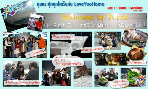 จากการวนเวียนดูหนังเกาหลีมาก็หลายเรื่อง ในที่สุดก็ได้ไปเกาหลีจนได้ รวบรวมสมัครพรรคพวกได้ 9 ชีวิต จึงติดต่อทัวร์ให้จัดกันแบบส่วนตัวไปเลย เพราะเราเที่ยวไม่เหมือนคนปกติ เพราะ 9 คนเป็นสาวๆกันหมด สาวมากสาวน้อยคละๆกันไป แต่ละคนมีภาระกิจส่วนตัวในการตามล่าหาขวัญใจหนุ่มเกาหลีไปต่างๆกัน ไหนจะช๊อปปิ้งไม่เหมือนใครอีก ไปส่วนตัวแหละดีแล้ว ต้นเดือนธันวาคม 2552 ได้ฤกษ์เบิกชัย แต่การเดินทางที่คิดว่าจะสบายกลับเพี้ยนๆเพราะเจอเอเยนต์ไม่ได้ดั่งใจ ก่อนบินไม่กี่วันดันมาบอกว่าต้องบินไปลงปูซานแทนโซล แต่ขากลับกลับจากโซลได้ เออเว้ย…..จะกลับลำยังไงได้ล่ะ เลยถือซะว่าได้มีโอกาสไปเห็นเมืองปูซาน เมืองท่าสำคัญของเกาหลีใต้ก็แล้วกัน แถมเป็นบ้านเกิด กงยู ดาราเกาหลีขวัญใจพวกสาวๆ 9 ชีวิตด้วย