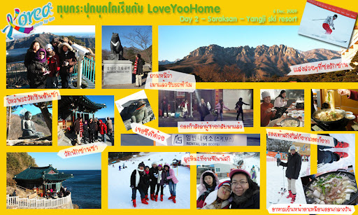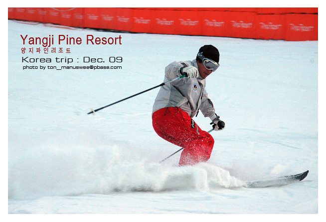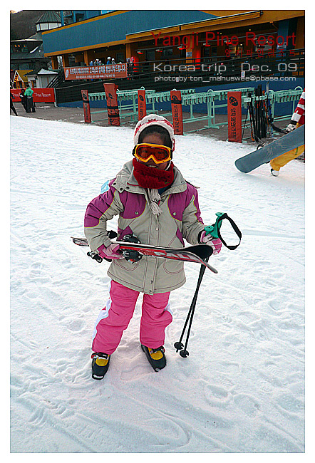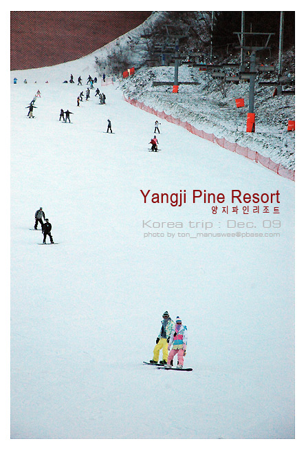 หลังอาหารพวกเราไปเช็คอินเข้าที่พัก ยางจีไพน์ สกีรีสอร์ทกัน (Yangji pine ski resort) ที่พักมีลานสกีให้เล่น อยากเล่นมาก แต่คงต้องเรียนก่อน อย่างน้อยคอร์สสั้นๆเริ่มต้นก็น่าจะสัก 3 ชั่วโมง เวลาเราไม่พอเช่นเคย เลยได้แต่ไปเดินเล่นลุยหิมะ นั่งดูคนเล่นสกี เล่นสโนว์บอร์ด อยากเล่นมากๆเลย พวกเรากลัวรองเท้าจะเปียกเลยเช่ารองเท้าของที่รีสอร์ท มันใส่ยากมาก หนักต่างหาก ต้องทำความเคยชินกันพักหนึ่งกว่าจะเดินคล่อง แต่ใส่แล้วลุยหิมะได้เต็มที่ รองเท้านี่เอาไว้ล็อคกับสกีหรือสโนว์บอร์ดเล่นได้เลย แต่เราไม่เช่าสกีเพราะเล่นไม่เป็น ก็ใส่ไปเดินลุยเอามันส์ ลานสกีที่นี่จะไม่ใช่แบบสถานที่ท่องเที่ยวมากนัก จะเป็นที่คนอยากเล่นสกีจริงๆมาเล่นกัน slope ไม่มากนัก (เราคิดเองนะจากที่มองดู) ที่นี่ไม่ไกลจากโซลมากนัก ยังมีสกีรีสอร์ทดังๆอีกหลายที่อยู่ใกล้ซอรัคซานมากกว่าแต่ก็ไกลจากโซล อ่านข้อมูลดูว่าใหญ่และมีวิวสวยมากว่า เช่น ยงเพียง สกีรีสอร์ท (Yongpyong) หรือ วิวัลดี สกีรีสอร์ท (Vivaldi) แต่เราว่าที่นี่ก็ใช้ได้นะ และเราจะได้กลับเข้าโซลเร็วด้วย