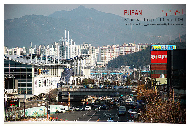 คิดในแง่ดีก็ต้องว่าโชคดีที่มีตั๋วไปเที่ยวได้ในช่วง long weekend อย่างนี้ ที่สนามบินสุวรรณภูมิ เสียงคนไทยคึกคักกรี๊ดกร๊าดไปทั่ว ต่างคนสนองนโยบายไทยเที่ยวไทย โดยการบินไปเมืองนอกกันเพียบ (ออกแนวสำนึกรักบ้านเกิดขึ้นมาซะงั้น) เนื่องจากความผิดพลาดนิดหน่อยทำให้เราเดินทางกันดึกไปนิด Korean airline flight KE652 บินตรงกรุงเทพฯ – ปูซานในเวลาห้าชั่วโมงกว่าๆ ออกเดินทางก็หลังเที่ยงคืนไปแล้ว หลับๆตื่นๆกันไป ก็ถึงปูซานตอนเช้าๆแดดกำลังเริ่มส่องพอดี แรกเห็นเกาหลีใต้จากหน้าต่างเครื่องบินมันเป็นทะเลสีฟ้าสวย แม้อากาศจะขมุกขมัวนิดหน่อย แค่นี้ก็ตื่นเต้นแล้ว สนามบินปูซานใหญ่โตโอ่โถงดีทีเดียว 9 ชีวิตเดินตามกันมาแบบหวาดๆจากคำขู่ของใครหลายๆคนว่าตม.ผ่านยาก เคยมีคนไม่ได้เข้าด้วย เมืองไทยมาเกาหลีไม่ต้องขอวีซ่าแต่ดันมาพิจารณาเอาที่สนามบินนี่ สู้ให้ขอวีซ่ายังดีซะกว่า ไม่ให้เข้าจะได้ไม่ต้องเสียค่าตั๋ว นี่ให้มาเสี่ยงดวงเอา มันนโยบายอะไรกันก็ไม่รู้แฮะ