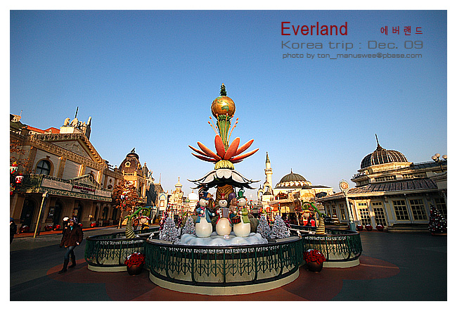 ก่อนไปเอเวอร์แลนด์ก็ต้องไปเพิ่มกำลังกับอาหารเที่ยงก่อน วันนี้ได้ลิ้มชิมรสคาลบี้ หมูย่างเกาหลี แบบไม่ใช่ 69 บาทบ้านเรานะ อันนี้หมูเขาชิ้นโตๆย่างแล้วห่อผักกาด คีบกิมจิแกล้ม อร่อยเหาะไป พี่ไกด์เตือนว่าอย่ากินให้อิ่มมากนะหากใครจะไปนั่งรถไฟเหาะตีลังกา เดี๋ยวหมูจะกลับออกมาแบบไม่ทันย่อย แหะๆ ช้าไปแล้ว ซัดกันไปพุงกาง จากร้านนั่งรถย่อยอาหารไปสักพักก็มาถึง เอเวอร์แลนด์ แดนมหาสนุก อากาศวันนี้ค่อนข้างเย็นแต่มีแดดสดใส เยี่ยมไปเลย