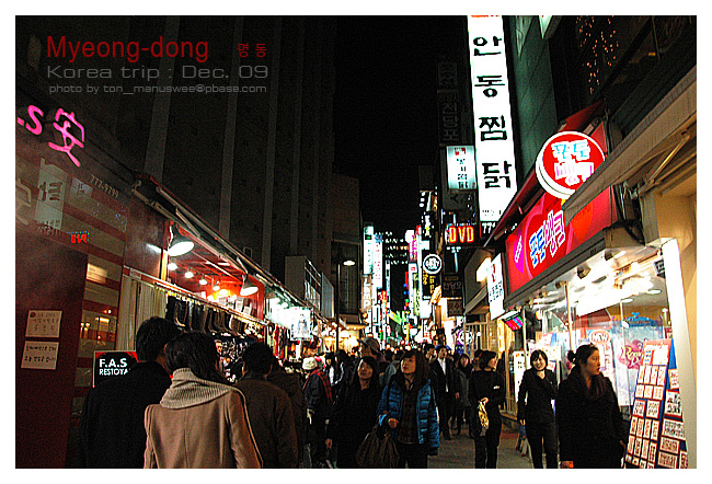 อิ่มท้องแล้วก็พากันไปเดิน เมียงดง (Myeongdong) ย่านช็อปปิ้งฮ็อตฮิต แลดูคล้ายๆสยามสแควร์บ้านเรา ค่ำมืดขนาดนี้ผู้คนยังเดินกันคึกคัก โดยเฉพาะคนไทย พบได้ตามร้านเครื่องสำอาง Etude house เอย Skin food เอย Rojukiss shop เอย คนไทยทั้งนั้น กวาดเครื่องสำอางลงตะกร้าเหมือนมันแจกฟรี น่ากลัวมากๆ ไอ้เราเองก็กวาดมาไม่ใช่น้อย คนฝากซื้อเยอะมาก เพราะถูกกว่าซื้อเมืองไทย 2-3 เท่าตัว เดินช็อปไปเรื่อยเปื่อย เสื้อผ้ารองเท้าก็ดูน่าสนใจเยอะแยะ เดินกันจนหมดแรงกลับโรงแรมที่พักซึ่งอยู่ใกล้ๆ ทำเลดีมากโรงแรมนี้ ออกมาเดินเมียงดงได้ทุกคืนถ้าเงินยังเหลือ!!!