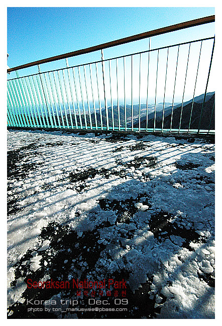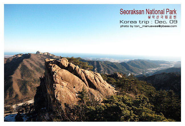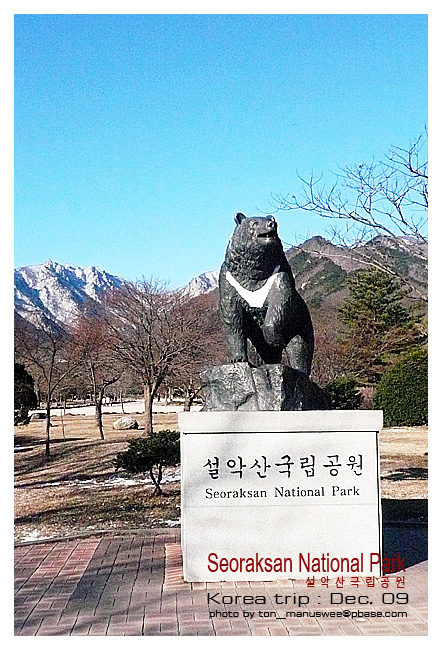ส่ง 4 สาวเสร็จ พวกเราที่เหลือ 5 คนก็นั่งรถขนาด 15 ที่นั่งกำลังเหมาะ มีที่วางกระเป๋าสบายๆ ออกเดินทางเพื่อไปซอรัคซาน อากาศวันนี้ที่ปูซานประมาณ 6°C ซึ่งพี่ไกด์บอกว่าอุ่นกว่าทางตอนเหนือที่พวกเรากำลังจะไป แต่แค่นี้ก็หนาวจะแย่ปรับตัวไม่ทัน การเดินทางอันแสนยาวนานบนรถเริ่มต้นขึ้น พี่ติ๊นาบอกว่าเป็นโปรแกรมที่แปล๊กแปลกค่ะ เพราะซอรัคซานอยู่เหมือนเชียงใหม่ ปูซานอยู่เหมือนหาดใหญ่ ใครหนอจัดโปรแกรมอย่างนี้ ยิ่งทำให้พวกเราสวดชยันโตเอเยนต์ในใจกันไปตลอดทาง แต่ด้วยว่าเป็นวันแรกในเกาหลี พวกเราจึงตื่นตาตื่นใจไปกับสองข้างทางพอควร แถมข้างทางยังมีหิมะปกคลุมประปราย หลับบ้างตื่นบ้างชมวิวบ้าง ระหว่างทางแวะทานอาหารกลางวันตรงที่พักกลางทาง เดินลงจากรถ หิมะโปรยปรายลงมา….ดีใจกันมาก หิมะแรกในเกาหลีที่โปรยลงมาให้เราได้เจอ พวกเราดีใจเริ่งร่ายืนรับหิมะกันเหมือนกระเหรี่ยงเข้ากรุง ในขณะที่คนเกาหลีพึมพัมๆ วิ่งหนีเข้าในตึก จากนั้นก็มีหิมะตกไปตลอดทาง รถยิ่งวิ่งช้าไปอีก