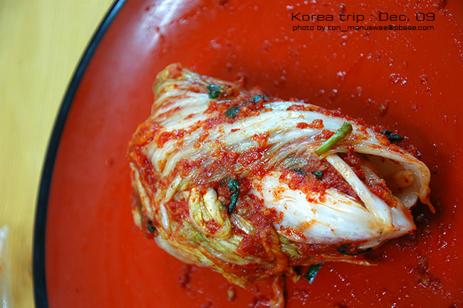 นั่งชมวิวข้างทางจากเมืองซกโชไปเรื่อยๆ หิมะตกประปรายไปตามเมืองต่างๆ จนเกือบบ่ายพวกเราก็มาถึงเมืองยงอิน โอปป้าคนขับรถเดินไปมองหาป้ายรถบัสที่สี่สาวจะลงด้วยความเป็นห่วง เพราะช่วงเช้าสาวๆโทรหาพี่ไกด์หลายครั้ง ด้วยว่าสี่สาวหลงทาง!! หาที่ขึ้นรถมายังไม่ถูกเลย พี่ไกด์ต้องช่วยส่งภาษาเกาหลีกับคนแถวโน้นให้ช่วยพาสาวทั้งสี่ไปขึ้นรถหน่อย นั่งรอกันสักพัก กะเหรี่ยงสาวทั้งสี่ก็ลากกระเป๋าพะรุงพะรังโผล่มาจนได้ พร้อมเสียงกรี๊ดกร๊าดของพวกเราต้อนรับการกลับมาอย่างอบอุ่น จากนั้นนกกระจอกก็แตกรังบนรถไปจนถึงร้านอาหารกลางวัน วันนี้อาหารหน้าตาเหมือนชาบูชาบูเมื่อคืนเลย แต่เป็นหมู ทานกับข้าว เครื่องเคียง กิมจิ เหมือนเดิม อาหารมาจึงเงียบเสียงกันได้