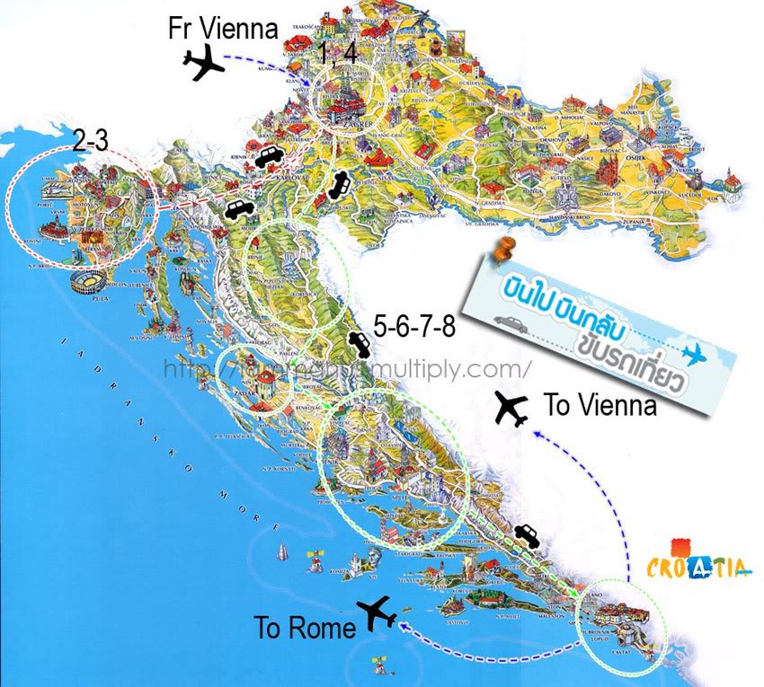 แต่การเดินทางจากเมืองไทยมันไม่ง่ายแต่ก็ไม่ยากเกินไปนัก เพราะไม่มีสายการบินใดบินตรงกรุงเทพฯ-ซาเกรป (Zagreb) เมืองหลวงของโครเอเชีย วิธีง่ายที่สุดคือบินไปลงอิตาลีหรือออสเตรียแล้วจึงเข้าโครเอเชีย แต่ที่นิยมกันมากคือการบินกรุงเทพฯ-เวียนนา (Vienna, Austria) แล้วต่อรถ หรือรถไฟ หรือเครื่องบินเข้าโครเอเชีย (ค่าเดินทางถูกกว่ามาจากอิตาลี) รายการท่องเที่ยวที่บริษัทฯนำเที่ยวนิยมจัดจึงเป็น ออสเตรีย – สโลเวเนีย – โครเอเชีย ซึ่งมีพรมแดนต่อเนื่องกัน เดินทางท่องเที่ยวได้ง่ายทั้งทางรถหรือรถไฟแสนสะดวกสบาย แต่พวกเราเป็นประเภทชอบเที่ยวแบบเจาะลึก มีเวลาแค่ 1 อาทิตย์ จึงเลือกบินต่อจากเวียนนาเข้าซาเกรปทันที แล้วเช่ารถตระเวนไล่เที่ยวจาก Zagreb ไปแถบ Istria และเลาะเลียบทะเลเอเดรียติคลงใต้ไป Split, Trogir, Dubrovnik โดยแวะเที่ยว Plitvice National park ด้วย แผนการเดินทางของพวกเราแบบง่ายๆน่ารักๆตามนี้