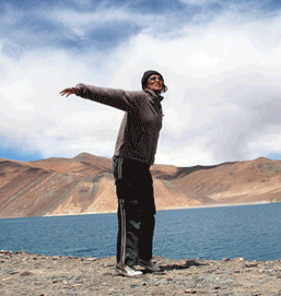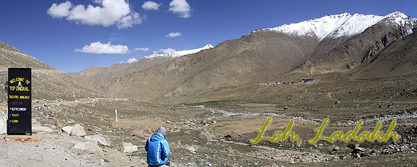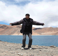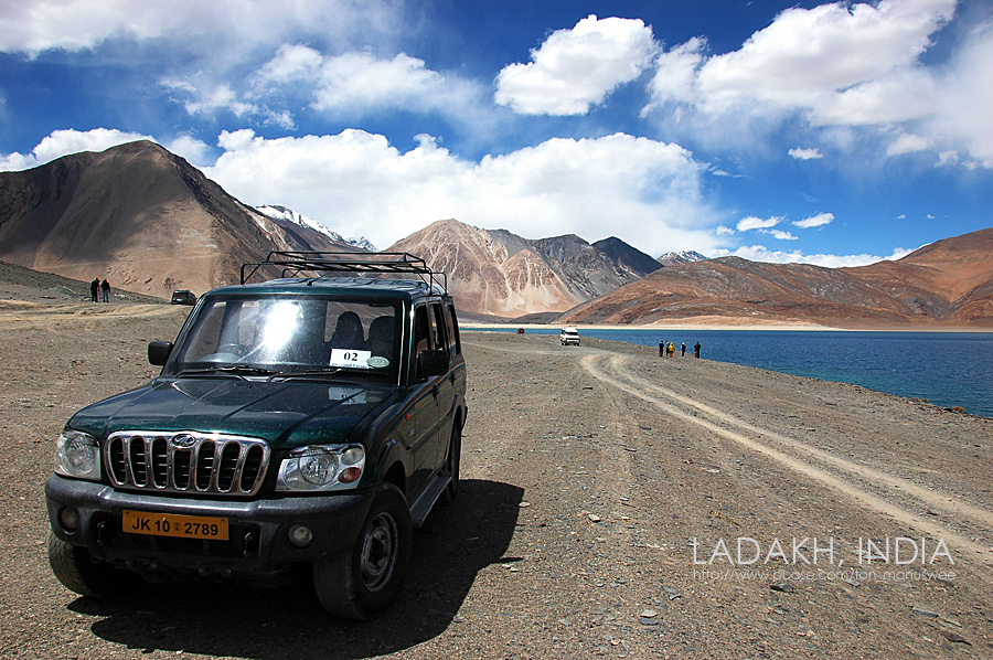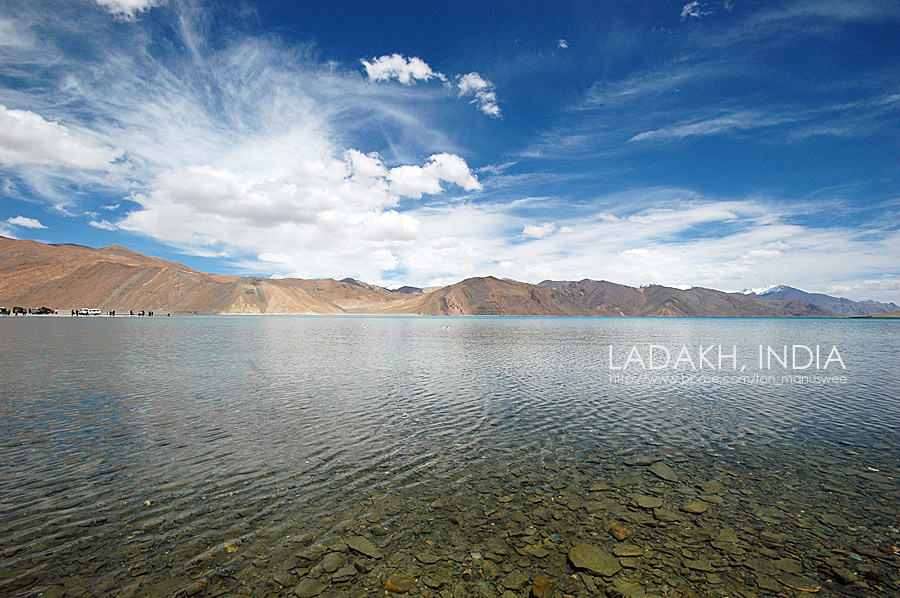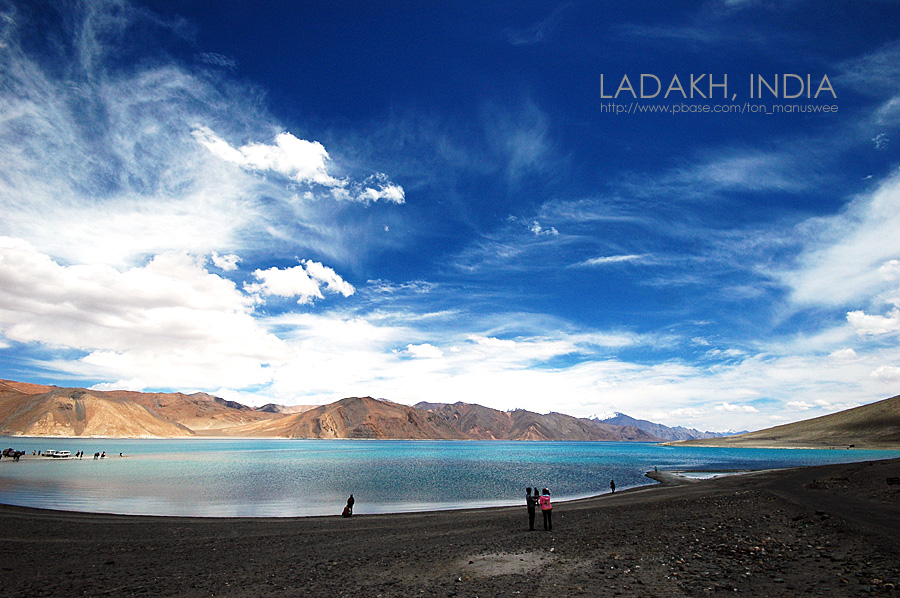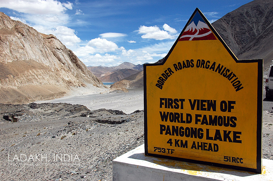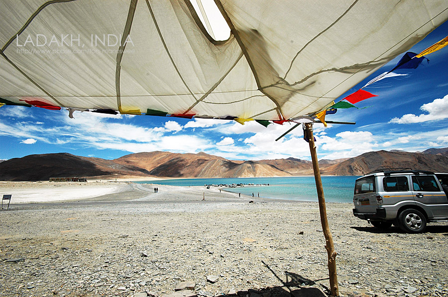 นั่งรถฝ่าหิมะกันไปอีกพักใหญ่ก็มาถึง Changla pass จุดสูงสุดของถนนเส้นนี้ รอบด้านมีแต่หิมะขาวๆท่าทางจะหนาวน่าดู เห็นมีรถจอดถ่ายรูป, เล่นหิมะกันอยู่หลายคัน ขบวนของเราเลยผ่านไปก่อน ยังคงขับผ่านยอดเขาหิมะไปเรื่อยๆ แต่ลดระดับลงบ้าง จนหิมะเริ่มหายไปเหลือเขาโล้นๆ แต่แม่น้ำลำธารยังเป็นน้ำแข็งอยู่เลย มีแวะตรวจพาสปอร์ตอีกครั้ง ลงไปเดินเล่น อืม…มันก็ยังหนาวจริงๆ ใกล้เที่ยงแล้ว ภูมิประเทศเริ่มเปลี่ยนเป็นเหมือนทะเลทราย ถนนตัดผ่านกลางทางราบมองเห็นแต่ทรายขาวๆทั้งสองด้าน ท้องเริ่มร้องแล้ว อยู่ดีๆรถคันหน้าก็จอดพรืดที่ไหล่ทาง คันอื่นๆรีบจอดตาม จุดนี้มีป้ายปูนเขียนว่า “First view of world famous Pangong lake” มองออกไปไกลๆก็มองเห็นทะเลสาบสีฟ้าอยู่ระหว่างหุบเขาข้างหน้า พวกเราเกือบจะถึงกันแล้วซินะ