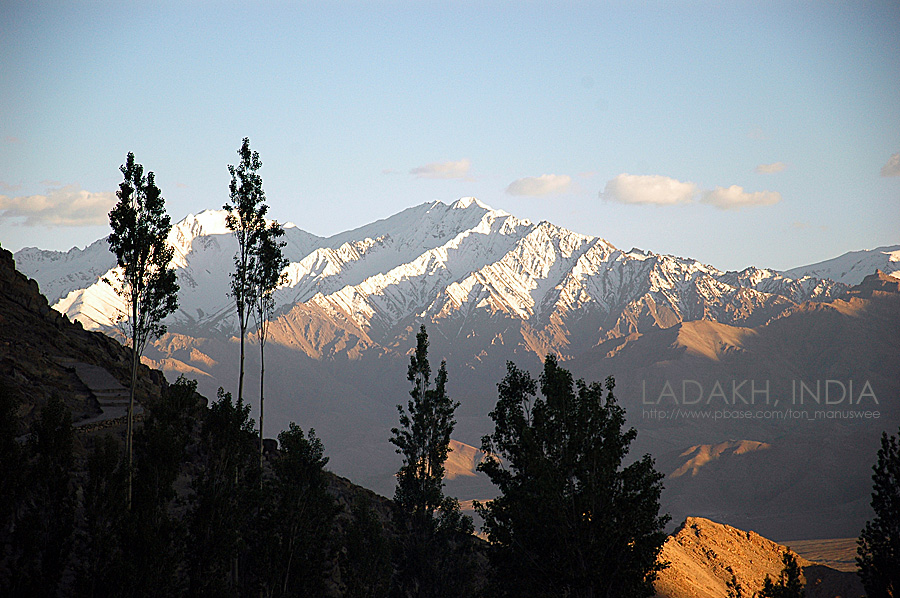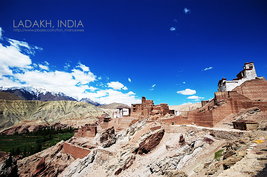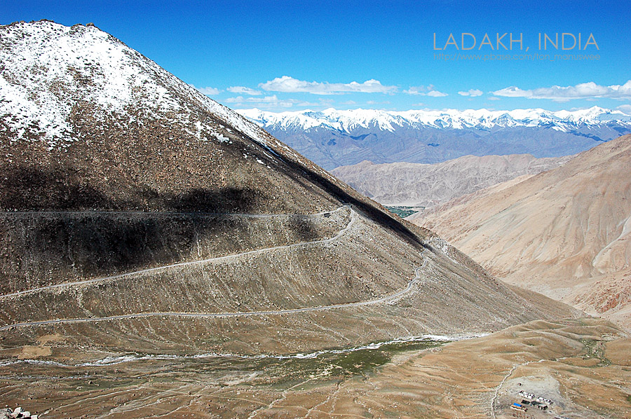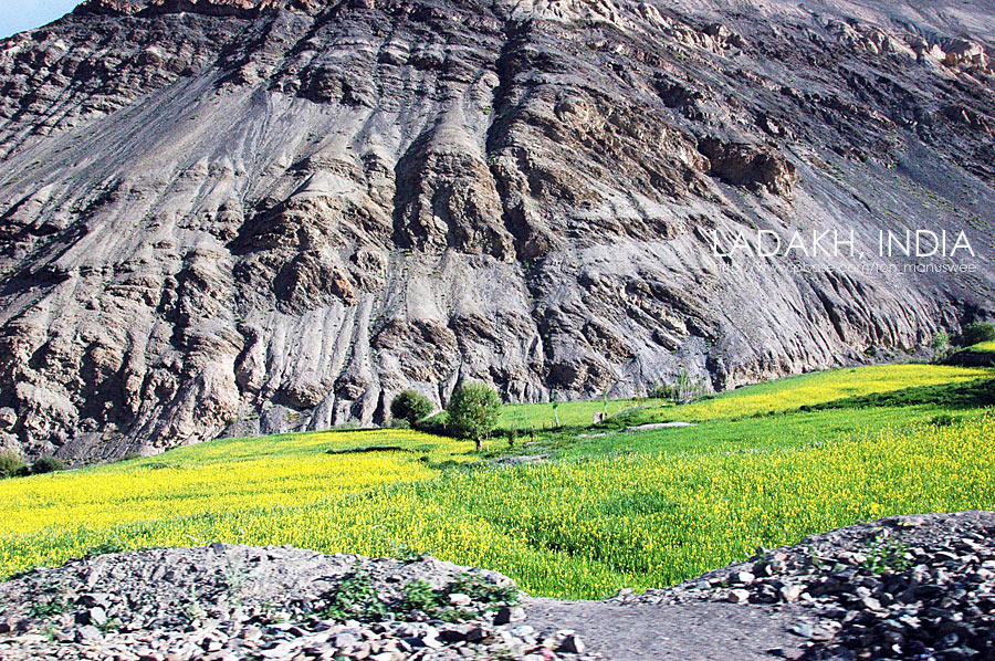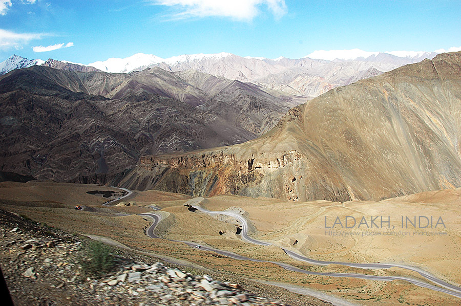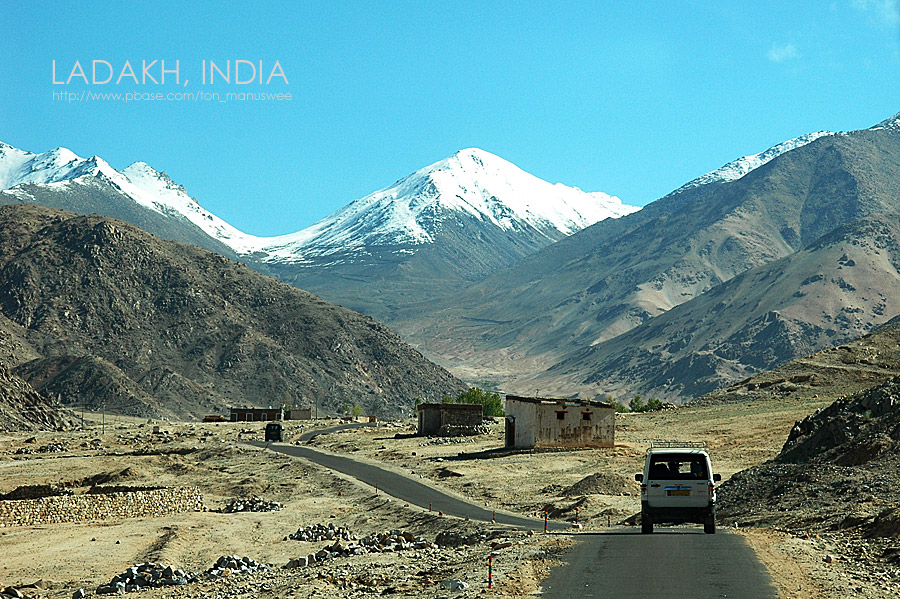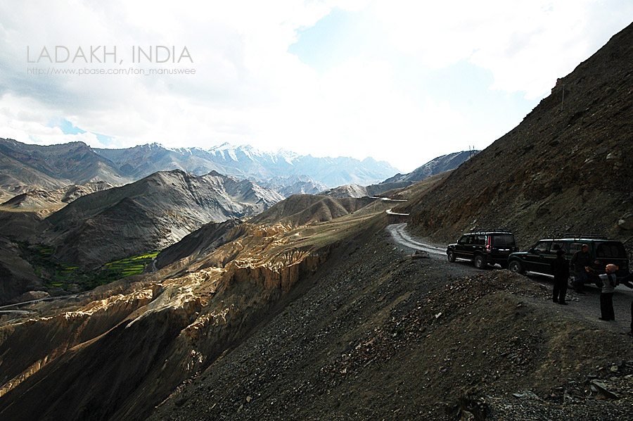เริ่มออกเดินทางกันเช้าหน่อยวันนี้ ขบวนของเราใช้ทางเส้นเดิมกับเมื่อวาน วิ่งไปจนถึงทางแยกเมืองคารู แต่คราวนี้เราแยกออกไปถนนเส้นซ้ายมือแทน จากจุดนี้ไปจะมีด่านเป็นระยะๆ ต้องเอาพาสปอร์ตไปให้จนท.ตรวจ จากแยกเมืองคารูไปเป็นเขตพท.ทหารซะเป็นส่วนใหญ่ มีรถทหารวิ่งเข้าวิ่งออกเป็นระยะ ให้บรรยากาศตื่นเต้นสลับตื่นตา (กับทิวทัศน์) ภูมิประเทศมีหลายรูปแบบเหลือเกิน จากถนนแคบๆวิ่งผ่ากลางพื้นที่ราบแห้งแล้งไประยะหนึ่ง ก็ผ่านมาเจอหุบเขา จากนี้เราจะต้องไต่เขากันแล้ว ถนนเลนครึ่งชวนเสียวเวลามีรถสวน มองด้านซ้ายมือจะเป็นหุบเขาตัดลงไป มองเห็นนาขั้นบันไดเขียวๆสวยดี ไต่ความสูงไปเรื่อยๆ โค้งซ้ายโค้งขวา พี่คนขับก็ใช้วิธีการขับแบบลาดัคห์แท้คือบีบแตรและไม่ต้องเบรค แม้จะเจอรถใหญ่สวนลงมา พี่แกก็หลบชิดลงข้างทางไปเลยไม่มีแตะเบรคให้ความเร็วลด ซึ่งข้างทางก็ไม่มีรั้วกั้นอะไรเลยมองเห็นหุบเหวได้ชัดเจน ใครหลับลงได้ก็ใจแข็งเกิน