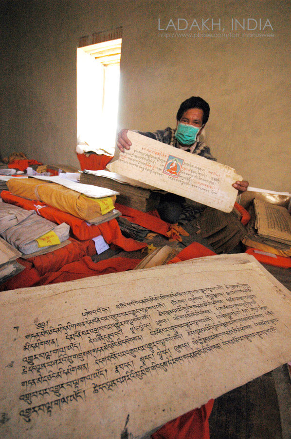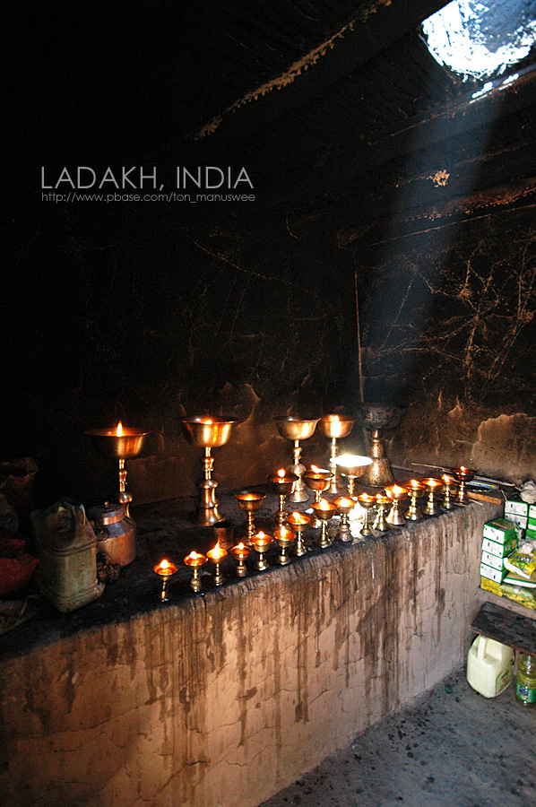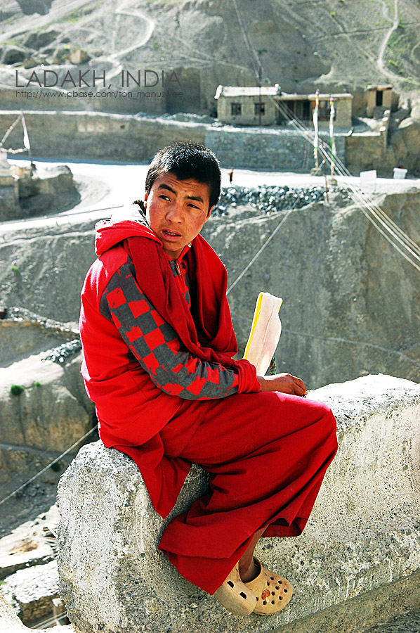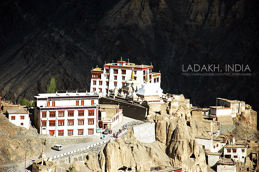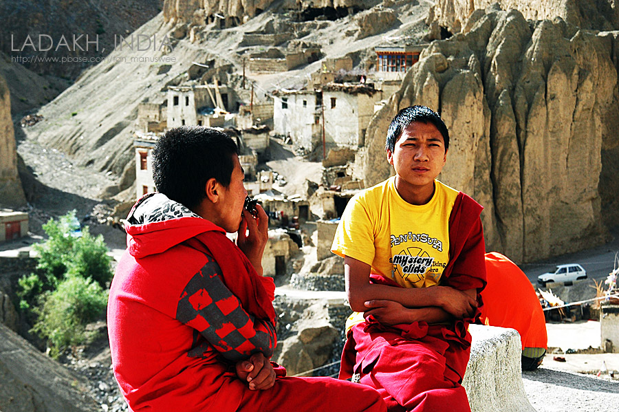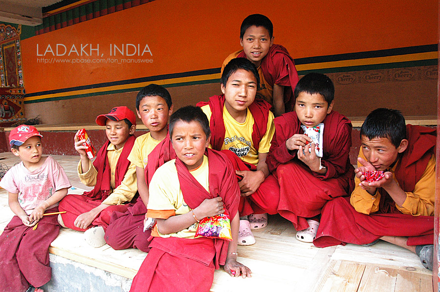 ในที่สุดก็มาถึง Lamayuru monastery วัดลามายูรู แห่งเมืองลับแลแสงยามบ่ายแก่สาดเข้าวัดพอดี รร.ที่พวกพี่เขาจะพักก็อยู่ใกล้วัดนั่นแหละ หันหน้าออกจากโรงแรมก็เป็นหุบเขามองเห็นเมืองตามเชิงเขาไล่ลงไปในหุบ หากรอจนพระอาทิตย์ตกคงสวยมากๆ คุณหนึ่งรีบพาเข้าไปในวัดกันก่อน ด้านในก็เหมือนวัดอื่นๆที่ผ่านมา เริ่มจำรายละเอียดไม่ได้แล้ว สนใจแต่จะเดินออกมาเก็บภาพด้านนอก รีบเดินไปตามมุมต่างๆเท่าที่เวลาจะมี ขึ้นไประเบียงชั้นบนมองลงมาเห็นลานวัดด้านในมีพระเด็กๆหรือเณรก็ไม่รู้อยู่เยอะเหมือนกัน เลยนึกได้ว่าเตรียมขนม+ลูกอมมาแจกเด็กเยอะแยะกลับไม่เจอเด็กเลยสักวัน ไม่รู้ไปอยู่ไหนกันหมด ผิดกับหลายๆประเทศที่ไปจะมีเด็กๆอยู่ตามสถานที่ท่องเที่ยวเยอะมาก บางพวกก็มาขอโน่นขอนี่ บางพวกก็เป็นลูกหลานแม่ค้าพ่อค้า แต่ที่นี่ดีนะไม่เจอเลย ขนมเลยเหลือบาน นึกได้รีบวิ่งลงไปเอาถุงขนมในรถเดินกลับมาแถววัดเจอพระรูปหนึ่งถามว่าจะไปไหนพอบอกว่าเอาขนมมาให้แกก็พาเข้าไปในวัด พร้อมถามว่ามีปากกามั๊ย เออ…ได้เจอคนขอปากกาจนได้ แม่เคยเล่าว่ามาแถบแคชเมียร์เจอคนขอปากกาเยอะมากให้เอามาแจกด้วยก็ลืมไป บอกท่านไปว่าไม่มี เอาขนมไปแจกเณรน้อย วิ่งมารับขนมกันใหญ่พอบอกว่าขอถ่ายรูปเลยยินดีรวมกลุ่มกันยิ้มเผล่…..