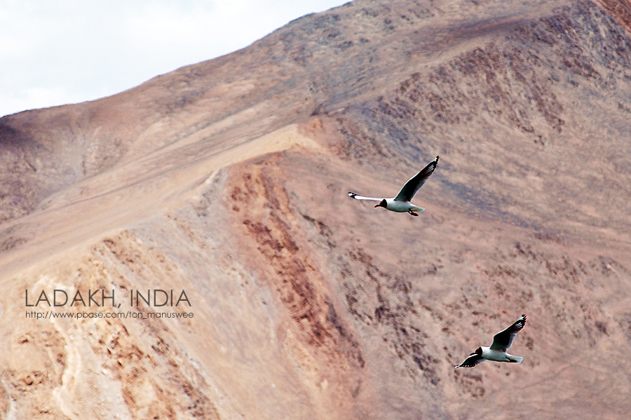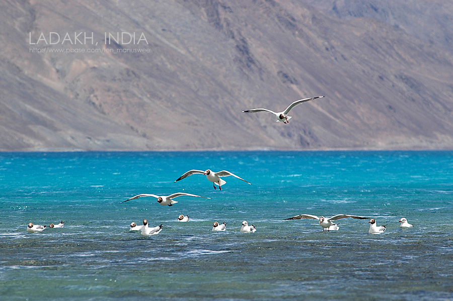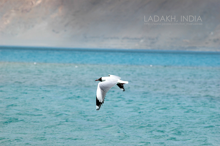 จากจุดนั้นไปอีกไม่นานพวกเราก็มาถึงทะเลสาบในเวลาเที่ยงตรง เวิ้งน้ำสีเทอควอยซ์สะท้อนภาพภูเขาหิมะอยู่ข้างหน้าพวกเราแล้ว แต่ก่อนอื่นคงต้องเติมอาหารกันก่อน พวกเรายึดทำเลที่เต๊นท์หลังใหญ่หลังหนึ่ง มีเก้าอี้นั่งหันหน้าออกไปทางทะเลสาบทุกตัว ต่างจับจองเก้าอี้เปิดอาหารกล่อง แม้ไก่จะเย็นข้าวจะแข็ง แต่วิวข้างหน้าก็ทำให้ทุกคนกินกันได้แบบไม่รู้สึกตัว (อาจเพราะหิวละมั๊ง) กินข้าวกันเสร็จก็แยกย้ายกันไปเดินกินลมชมวิวกันต่อ เราเองไปยึดริมทะเลสาบนั่งปักหลักยกกล้องยิงนกนางนวล ไม่ได้เดินมากมาย เอากล้องหันไปส่องซ้ายส่องขวาส่องนกส่องเป็ดอะไรไปเรื่อยเปื่อย มีนักท่องเที่ยวอินเดียประปรายตามริมหาด มุมแหลมด้านขวามีแก็งค์มอเตอร์ไซค์แก็งค์ใหญ่มาจอด คิดถึงทางที่เราผ่านมาแล้วนับถือจริงๆ