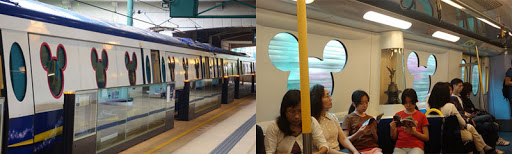 นั่งไม่เกิน 15 นาทีก็ถึง ลงรถก็เดินๆตามเค้าไปมันเป็น City gate mall ใหญ่โตใช้ได้เลย ถ้าขากลับว่างนั่งรถไฟมาลงที่นี่หาซื้อของฝากล็อตสุดท้ายก็คงได้แล้วค่อยต่อรถเมล์เข้าสนามบิน ก็เดินมาเรื่อยๆมองหาป้าย MRT หรือรถไฟฟ้าของเค้า หยิบแผนที่มาดูเพื่อความมั่นใจนะว่าจะไปไหนนั่งรถสายสีอะไร แต่ที่ Tung Chung นี่เป็นต้นสายสีเหลืองนั่งไปลงสถานีหน้าคือ Sunny bay แล้วเปลี่ยนเป็นสายสีชมพูไป Disneyland ง่ายมาก กางแผนที่รถไฟแล้วนั่งไปตามนั้นแหละบัตรปลาหมึกก็เอาแปะเข้า และแปะออกตอนออกเหมือน BTS บ้านเรานั่นแหละ ข้อควรระวังการนั่งรถไฟคือมองให้ดีๆว่าไปฝั่งซ้ายหรือฝั่งขวานะ อย่านั่งผิดฝั่ง