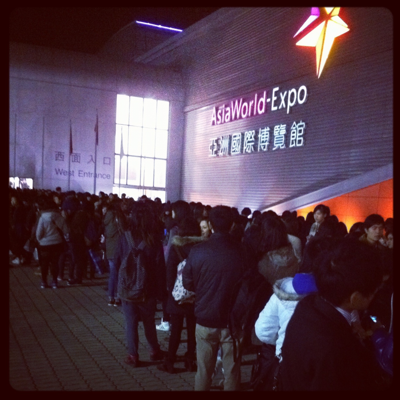 วันแรกกว่าจะมาถึงก็บ่ายแล้ว ทำโน่นๆทำนี่ ก็ต้องรีบบึ่งไป Asia World Expo เพื่อไปดูคอนฯ ต้องนั่งรถไฟย้อนกลับไป TungChung แล้วต่อรถรับส่งไป อากาศก็แสนจะหนาว ลมก็แรง ใครไปที่นี่ช่วงหนาวๆเตรียมเสื้อหนาวไปหนาๆนะคะ อิตอนรันคิวจะเข้าฮอลล์นี่ทรมานสุดเหอะ ให้ยืนคิวด้านนอก กว่าจะตรวจโน่นนี่จะแข็งตาย จบคอนฯคืนแรก กลับโรงแรมซื้อของทอดหน้าปากซอยไปกินเพราะหมดแรง