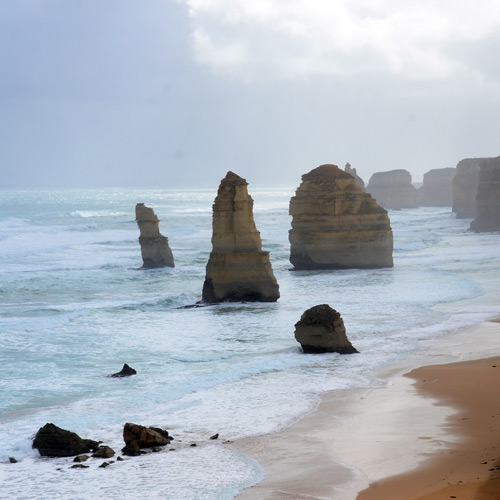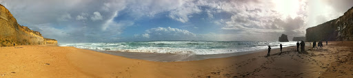 จุดต่อไปคือไฮไลต์ของวัน (เค้าว่ากันว่างั้น) Twelve Apostles ซึ่งอยู่ในเขต Port Campbell National Park มันเป็นแท่งหินธรรมชาติที่อยู่ในทะเล โดนลมโดนฝนมากี่พันปีกัดเซาะจนเป็นแท่งๆแง่งๆ แต่ก่อนคงมี 12 เลยได้ชื่อว่างั้น ตอนนี้เหลือไม่ถึงหรอก บางคนนับได้ 8 บางคนนับได้ 9 แล้วแต่จะนับอะไรบ้าง หากใครล่ำซำสามารถซื้อทัวร์พิเศษขึ้นคอปเตอร์บินชมวิวได้ แต่ดูท้องฟ้าเถิดพี่น้องไอ้แดดแจ๋ๆฟ้าใสๆนั่นมันอยู่ตรง Otway ที่เดียวจริงๆ มาที่นี่ครึ้มอีกแล้ว ลมก็แรงมาก ไม่ควรค่าแก่การขึ้นเลย แต่ก็มีคนขึ้นนะ เห็นคอปเตอร์สีแดงแปร๊ดบินขึ้นเป็นระยะๆ