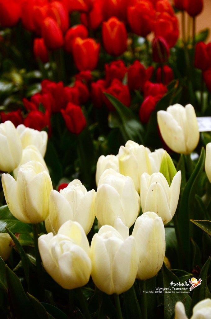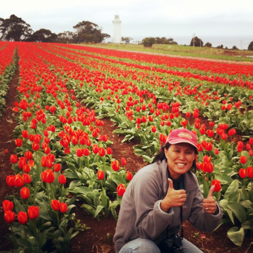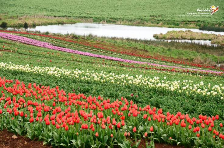 ออกจาก Penguin ขับตามถนนเส้นในไปเรื่อยๆ ไม่นานก็ถึง Wynyard อากาศก็อึมครึมอยู่อย่างนั้น ลมพัดแรงมากๆ ยิ่งตอนขับรถไปทาง Table cape นั่นจะต้องขึ้นเนินเขาไปนิดหน่อย และใกล้ชายฝั่ง ยิ่งลมแรงใหญ่ สังเกตป้ายจะมี Tulip festival เขียนไว้ จึงมั่นใจขับไปเรื่อยๆ สักพักก็เห็นป้ายชี้ว่า Tulip farm รีบเลี้ยวรถเข้าไปทันใจ โอ้ว…มีทิวลิปเป็นทุ่งจริงๆ แต่ไม่แน่นมาก บางแนวยังไม่บานเลย ที่นี่เป็นฟาร์มเอกชน มีป้ายบอกว่า ค่าบำรุงสถานที่คนละ 5AUD แต่ก็ไม่มีคนเฝ้าคนเก็บเงิน 2 สาววิ่งลงแปลงดอกไม้ทันที ทั้งๆที่หนาวจับใจ แต่ไม่แน่ใจอากาศที่ทัสมาเนียเลย กลัวฝนลงเลยรีบวิ่งไปชมก่อน 1หนุ่มเลยเดินไปจ่ายเงินให้ในเคาเตอร์ด้านใน มาคราวนี้ได้รู้จักทิวลิปหลายแบบหลายพันธ์ บางดอกก็ไม่เคยคิดว่าจะเป็นทิวลิป ยิ่งพอเข้าไปด้านใน เค้าจะติดป้ายชื่อพันธ์ต่างๆไว้ด้วย ใครชอบมากๆเค้ามีตัดดอกขายด้วย