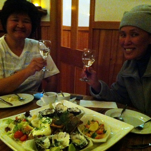กลับมาวนหาที่พักเจอก่อนมืด วิวงามจริง เพราะมองเห็น The Nuts ได้อย่างงาม มิน่าห้องอาหารเค้าชื่อ Nuts View Restaurant วันนี้เป็นห้องแบบโรงแรม เลยไม่ได้ซื้ออาหารอะไรมาทำ ขี้เกียจขับออกไปอีก เพราะเย็นแล้ว อารมณ์เหมือนเมืองร้าง ทำไมมันเงียบอย่างนี้ เลยฝากท้องกันที่ Nut View นั่นแหละ โลกโดดเดี่ยวก็แนะนำไว้ด้วย อาหารอร่อยใช้ได้เลยทั้ง Lamb steak และ Seafood BBQ แกล้มไวน์ขาวท้องถิ่น อิ่มหลับสบายทีเดียวเชียว