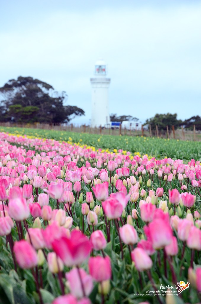 จากที่ฟาร์มนี้มองไปจะเห็น light house สีขาวๆอยู่ไม่ไกลนัก คงเป็น Table cape light house ไม่น่าไกลจากตรงนี้ ตัดสินใจขับรถต่อไปตามป้าย เลี้ยวซ้าย 1 ที เลี้ยวขวาอีก 1 ที โอ้ว….แม่เจ้า ด้านหน้า Light house มีทุ่งทิวลิปใหญ่โตสีสันสวยงาม ให้ได้ถ่ายรูปกันสบายๆ ถึงจะล้อมรั้วไว้ แต่ก็เปิดประตูไว้เลย ไม่มีคนไม่มีใคร ดอกก็ออกเต็มสวยงาม ถ่ายได้เลย พร้อม Lighthouse เป็นฉากหลัง ดังนั้นใครมาก็ให้พุ่งตรงมาที่ประภาคารเลยนะ ไม่ต้องแวะที่อื่น ดูตามโปสการ์ดแล้ว หากขึ้นไปบนยอดประภาคาร (เสีย 7AUD) มองลงมาจะเห็นทุ่งทิวลิปเต็มไปทั้งหมดสวยงามมาก แต่ช่วงนี้มองไปโดยรอบ ยังเห็นไถหว่านกันอยู่เลย คงไม่คุ้มที่จะขึ้น เลยถ่ายรูปกันที่ทุ่งนี้อีกพักก็รีบออกเดินทางต่อ (หนังสือนำเที่ยวก็บอกให้มาดูทวิลิปที่ Table cape นี่ แต่เราใจเร็วเจอป้ายก็รีบเลี้ยว เลยเจอของเอกชนนะ)