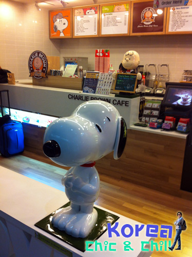 แถบฮงอิกมันมีร้านกาแฟ Chalie Brown ด้วยนะน้องเจนบอก มันเหมือนร้านที่ฮ่องกงที่ทั้งร้านเป็นธีมสนู๊ปปี้และชาลี แต่คราวนี้ไปเดินหาไม่เจอ เหมือนว่ามันจะปิดไปแล้ว อ่านตามรีวิวแนะนำก็บอกว่าอยู่ใกล้ๆร้านไก่ Kyochon เราเจอร้านไก่แต่ไม่เจอร้านกาแฟ น้องเจนเคยมาแล้วก็พาเดินวน 2 รอบไม่เจอเลยเลิกหา แต่สุดท้ายมาเจอมันที่สนามบินอินชอน มันมาเปิดเป็นร้านเล็กๆไม่มีที่นั่ง ที่สนามบินด้านในทางเดินไปเกท 20 กว่าๆประมาณนั้น