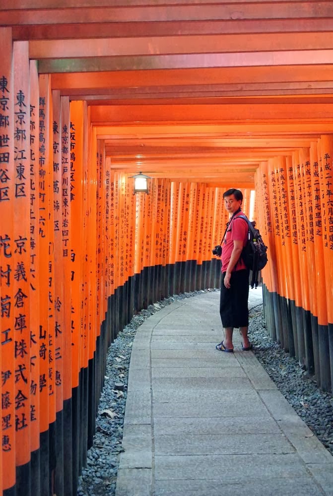 มาถึงสถานีเกียวโตตรงเวลาเป๊ะๆ ที่พักที่เลือกวันนี้แพงสุดในทริปล่ะ เพราะอยู่ตรงข้ามสถานีรถไฟเลย เป็นโรงแรมแบบ 3 ดาวได้ พนักงานพูดภาษาอังกฤษปร๋อ ดีทุกอย่างยกเว้นไม่รวมอาหารเช้า เราเข้าไปเช็คอินแล้วล้างหน้าล้างตาพักผ่อนแป๊บนึง ก็ออกมาเริ่มตะลุยเกียวโต บ่ายนี้เราจะลงไปด้านใต้ของแผนที่ โดยนั่งรถไฟ JR Nara line ไปลงสถานี Inari แค่ไม่กี่ป้ายเอง ลงที่สถานีเล็กๆเหมือนแถบชนบท แต่นักท่องเที่ยวลงกันค่อนขบวน ออกจากสถานีเดินๆตามเค้าไป โผล่พ้นสถานีรถไฟก็เจอเสาโทริอิสี.แดงแปร๊ด ถูกที่แน่แล้ว เราจะมา ศาลเจ้า Fushimi Inari กัน ศาลเจ้านี้มีรูปที่ผู้คนทั่วไปได้เห็นคือ เสาโทริอิสีแดงยาวเป็นแนวตลอดทางเดิน พวกเราเดินขึ้นไปเรื่อยๆ มันคือการเดินขึ้นเขาดีๆนี่เอง พอขึ้นพ้นเนินแรก ก็จะเจอแล้วแนวเสาโทริอิ มันจะแบ่งเป็น 2 ทางซ้ายขวาไปทางไหนก็ได้ มันไปบรรจบกัน จัดแจงถ่ายรูปกันทุกคนแช๊ะๆๆๆ เราเดินทางซ้ายไปจนสุดแล้ววนกลับทางขวา จริงแล้วมันเดินต่อขึ้นไปได้อีกเป็นกิโล เพื่อขึ้นไปวัดด้านบน เห็นว่ามีจุดชมวิวเมืองได้ ถามว่าจะเดินมั๊ย ตอบเลยว่าไม่ 555 มาถ่ายรูปเสาค่ะ ถ่ายจนหนำใจก็ลง
