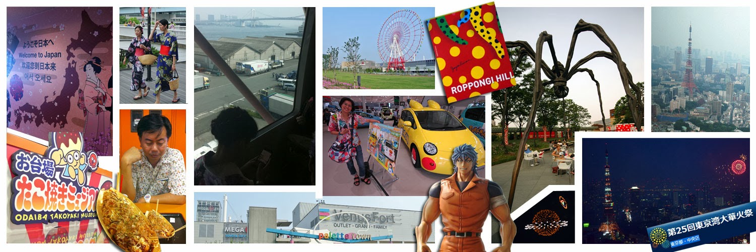 โอไดบะเป็นเมืองใหม่ เมืองแห่งเทคโนโลยี่ คุณจะเที่ยวอะไรก็ตามใจ มันเที่ยวได้ทั้งวันอ่ะ ยกตัวอย่าง 3D Museum, Joypolis Sega แต่เราแค่ไปเดินเที่ยวในห้าง The Deck ที่ชั้น 3 หาข้าวกิน มันทำบรรยากาศย้อนยุคด้วย กินทาโกะยากิที่ Takoyaki museum อันนี้ก็เรียกดูหรูไปนะ มันแค่รวบรวมร้านทาโกะยากิเจ้าดังมาไว้ด้วยกันแค่นั้น สรุปเลยได้กินทาโกะยากิเป็นอาหารเที่ยง เพราะไม่มีอย่างอื่นกิน ใน The Deck วันนี้มีงานคนเลยเยอะมากกกกกกกก ก็ดูบรรยากาศครึกครื้นดี แต่เข้าเล่นอะไรไม่ได้เลย คิวยาวมาก เลยอาศัยเดินเล่นไปทั่วๆ มองลงไปสวนด้านล่างคนเอาเสื่อมาจองที่ดูพลุกันแล้ว เห็นแดดแล้วสยอง เลยไม่ลง จริงๆมันมีเทพีเสรีภาพจำลองเป็นสัญญลักษณ์ของแถบนี้ด้วยนะ เลยไม่ได้ลงไปถ่ายรูป แพ้แดดแพ้คน จากนั้นเลยเดินข้ามไป Venus Fort เป็นอีกคอมเพล็กซ์ ไม่มีอะไรเอาไว้ช็อปปิ้ง เราเลยผ่านไป Mega Web ไปดูโตโยต้ามิวเซียมกันนะ ทั้ง 2 ที่นี่นั่งรถไฟก็ได้นะ ไปอีกสถานีนึง แต่มันเดินได้มีทางเดินไปสบายๆมีหลังคา แค่ร้อนเหงื่อแตก 555 เข้าไปเดินดูรถนวัตกรรมใหม่ๆ มีเครื่องเล่นให้ทั้งผู้ใหญ่และเด็กเล่นได้ น่าสนใจดี แต่ขี้เกียจต่อคิวอีกเช่นเคย