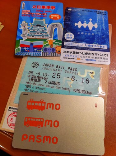 JR Pass : JR pass ขายให้กับนักท่องเที่ยวต่างชาติเท่านั้น ต้องซื้อจากเอเยนต์ก่อนไปญี่ปุ่น เช่น H.I.S. ซื้อแล้วต้องใช้ภายใน 3 เดือน ช่วงที่เราซื้อเงินเยนยังลงอยู่เลยซื้อได้ในราคา 8 พันกว่าบาทสำหรับแบบ 7 วัน (ตอนเดือน 9 เห็นว่าเยนขึ้น กลายเป็น 9 พันไปแล้ว ตอนนี้เงินบาทอ่อนปวกเปียก ก็คงไม่ต้องพูดถึง) บัตรมีแบบ 7, 14 หรือ 21 วัน เลือกซื้อตามจำนวนวันที่ต้องการใช้ และต้องใช้ต่อเนื่อง ข้ามวันไม่ได้ สามารถใช้ขึ้นรถลงเรือรถใต้ดินบนดินที่เป็นของ JR ได้ทุกอย่างตลอดเวลาตามจำนวนวันที่เราซื้อ พาสใบใหญ่ๆนี้ไม่ต้องเอาไปแตะประตูทางเข้าออกอัตโนมัติ แต่ให้เดินออกช่องทางออกริมสุดที่มีจนท.ยืนอยู่ ยกใบให้เค้าดู จะเห็นวันที่ใช้อยู่ว่าหมดอายุวันไหน จนท.แค่มองดู