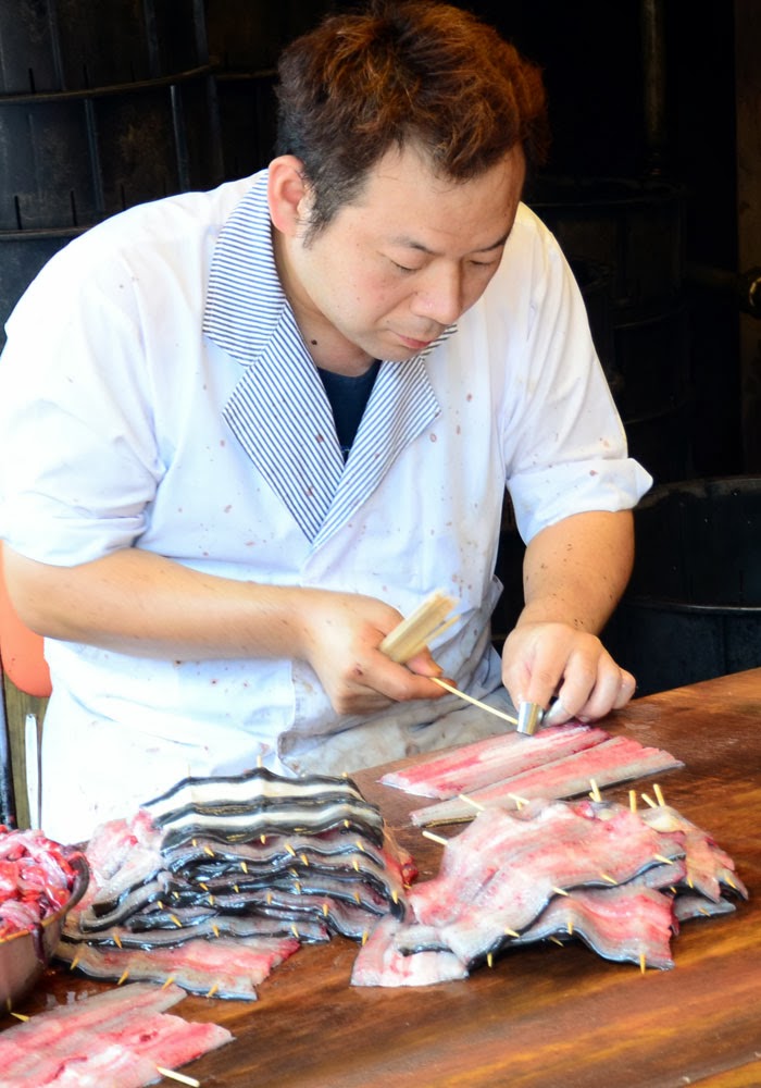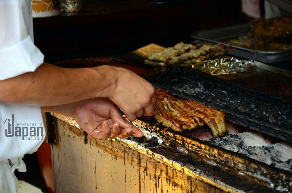 ตามโพยบอกว่าไปทางเดียวกับวัดนาริตะ เลยอาศัยถามทางเค้าไป ลุงก็ชี้ทางสว่างให้ เดินไปเรื่อยๆทางลงเนินไปยาวอยู่ พอเข้าถูกถนนจะรู้เลยเพราะมีร้านขายของ 2 ข้างทาง วันนี้นักท่องเที่ยวน้อยมาก เดินเหงาๆลงเนินไปเรื่อยๆจนเจอร้านข้าวหน้าปลาไหลจนได้ พิกัดง่ายๆคืออยู่ฝั่งขวามือตรงข้ามศูนย์ข้อมูลการท่องเที่ยวนาริตะ หน้าร้านจะมีการชำแหละปลาไหลกันแบบโจ๋งครึ่ม สะใจกันไปเลย เตาย่างก็อยู่ข้างๆย่างกันควันขโมง คนเต็มร้านเหมือนกัน แต่เราโชคดีมีโต๊ะพอดีไม่ต้องคิว นั่งปุ๊บสั่ง Unaju (うな重) มา 2 ที่พร้อมซุป ได้ที่นั่งด้านหน้าเลย ระหว่างรอก็ดูการชำแหละไป ฮ่าๆๆ