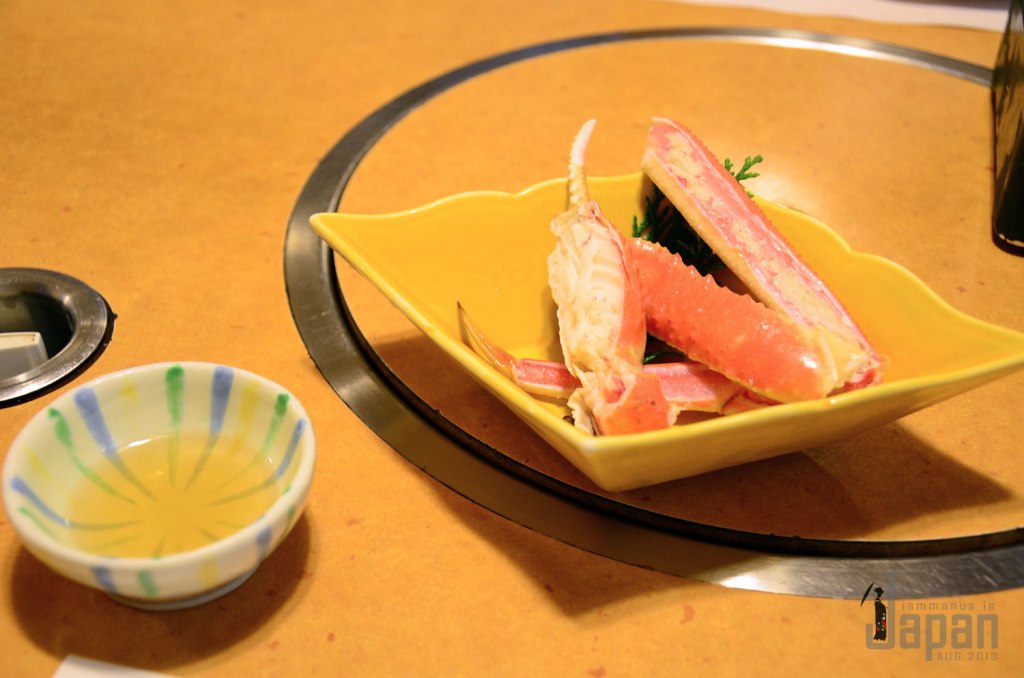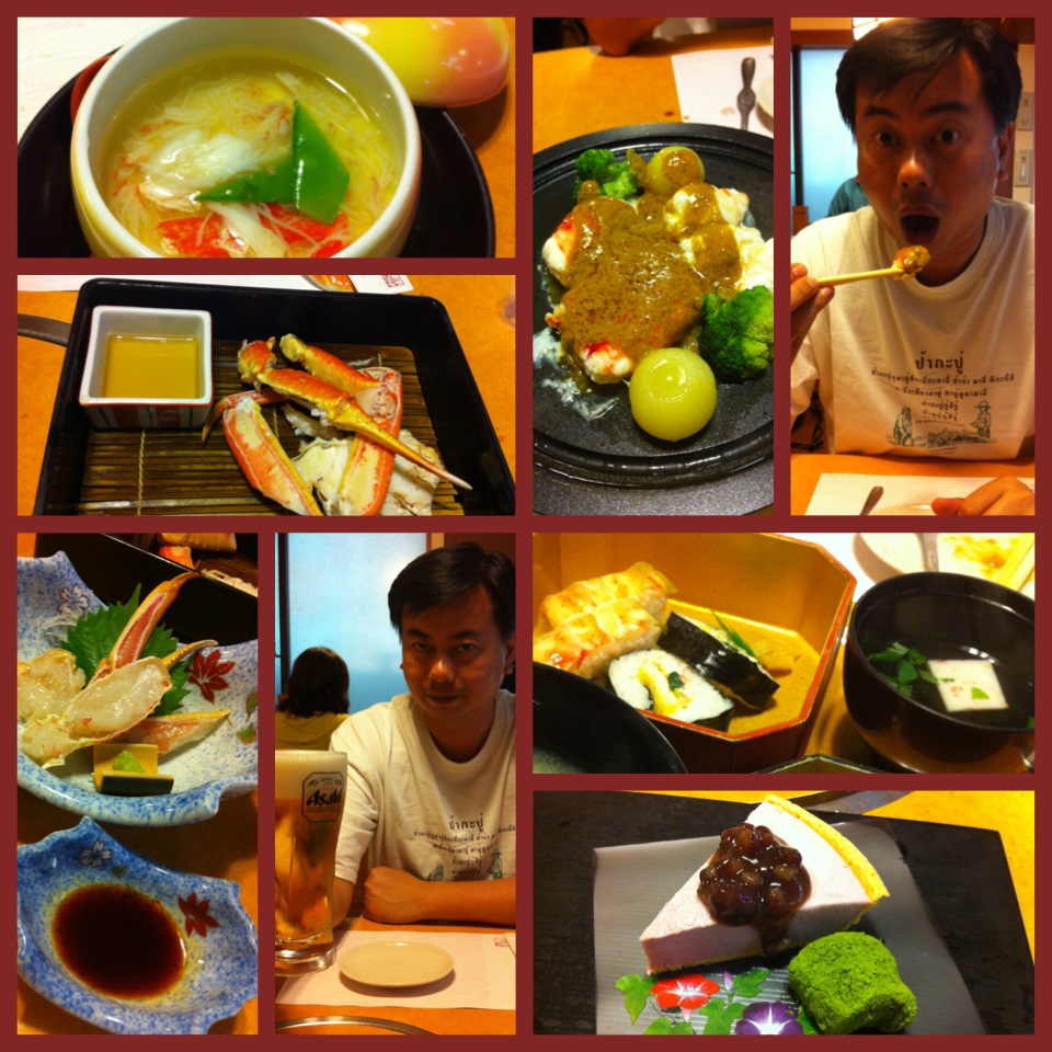 เข้าไปอาบน้ำนอนเกลือกกลิ้งพักใหญ่ หิวได้ที่เลยชวนกันออกไปกินปู มาโอซาก้าทั้งทีต้องกินปูร้านดังที่มีปูตัวใหญ่ๆขยับก้ามงึกงักๆ เดินจากที่พักไปนิดเดียวข้าม 1 ถนนก็มาถึงย่าน Tombori แล้ว ผู้คนคึกคักน่าดู โผล่มากลางย่านก็เจอปูยักษ์เลย ดูชื่อร้านแล้วใช่ตามนั้นเลยเข้าไปบอกเค้า รอคิวแป๊บนึงนะ ร้านมี 7-8 ชั้นแต่เต็มหมด แต่ก็รอไม่นานได้ขึ้นชั้น 5 นั่งริมกระจกได้กินปูพร้อมชมแสงสีด้านล่างด้วย เปิดเมนูเลือกจิ้มๆไปตามฐานะของตัวเองได้เลยค่ะ อย่าไปคิดมาก มันเป็นอาหารเซ็ตเค้าจะเอาปูมาทำโน่นนี่นั่นเสิร์ฟมาเรื่อยๆ เราเลือกมาคนละชุด แล้วแบ่งกันชิม อิ่มกำลังดี ก็อร่อยดีนะ