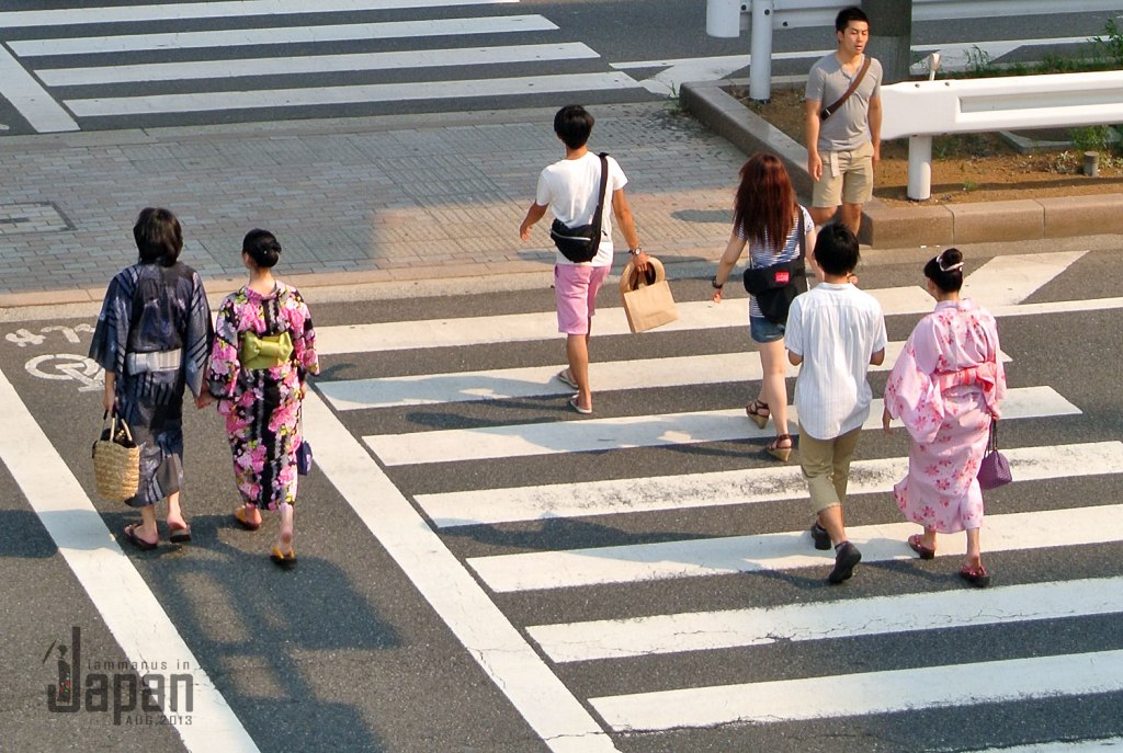 บ่ายนี้จะไปเที่ยวโอไดบะกัน จาก Akabane ไปให้ถึง Shimbashi เพื่อไปเปลี่ยนรถเป็นรถไฟ Yurikamome line อันนี้ต้องจ่ายเพิ่ม รถไฟจะวิ่งข้ามสะพานสายรุ้ง (Rainbow bridge) เพื่อไป Odaiba ที่เป็นเมืองใหม่ วันนี้ผู้คนใส่ชุดยูกาตะกันเยอะแยะไปหมด เห็นแล้วชอบจริงๆ มันเป็นงานเทศกาลฤดูร้อน ตอนกลางคืนจะมีเทศกาลดอกไม้ไฟ โชคดีมาช่วงงาน Tokyo Bay Grand Firework festival พอดี มีจุดพลุกันเป็นพันดอก นึกถึงการ์ตูนที่อ่านกันตอนเด็กๆ พระเอกนางเอกใส่ชุดยูกาตะมาเดินเที่ยวกัน อย่างนั้นเลย ^^