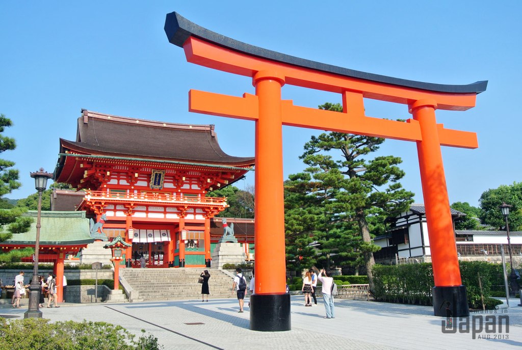 - Fushimi Inari ศาลเจ้าฟูชิมิ อยู่ด้านล่างของแผนที่ จุดเด่นคือเสาโทริอิสีแดงสดที่สร้างไว้ตามทางเดินยาวและคดเคี้ยว สามารถเดินไต่เขาขึ้นไปจนสุดชมวิวเมืองเกียวโตได้