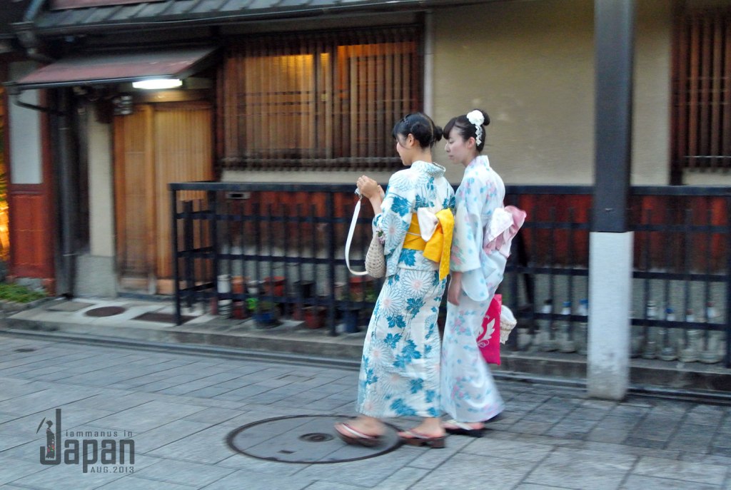 นั่งรถไฟกลับไปสถานีเกียวโต ออกมาที่ป้ายรถเมล์ รอรถเมล์สาย 100 หรือ 206 จะไปกิอง (gion) กิองเป็นย่านเมืองเก่าที่เค้าพยายามอนุรักษณ์ไว้ เค้าบอกว่ายังมีเกอิชา หรือไมโกะ (เกอิชาฝึกหัด) เดินให้ได้เห็น นั่งรถเมล์ไปลง ป้าย Gion แล้วเดินย้อนมาทางศาลเจ้ายาสุกะ (ศาลเจ้าใหญ่ที่อยู่ตรงสามแยก) แล้วเลี้ยวไปอีกหน่อย อธิบายจะงงดูแผนที่เอาแล้วกัน สุดท้ายก็เจอถนนที่ว่า เดินเข้าไปสองข้างทางเป็นร้านอาหารทั้งนั้น ล้วนแต่แพงๆ เพราะไปยืนดูราคาแล้ว แต่ร้านก็คงภาพลักษณ์แบบโบราณไว้ตลอดทาง เดินไปจนสุดถนน มีวัดอีก มันปิดแล้วแหละ แต่ก็เดินเข้าได้ ไม่เสียตังค์ล่ะ เข้าไปสวยดีใหญ่ดีสงบดี เดินกลับออกมาผ่านศูนย์ Gion Coner Center ที่นักท่องเที่ยวเริ่มมากันเยอะแยะ เพราะมีโชว์ให้ดู เป็นโชว์ที่มีไมโกะมีเกอิชามาแสดงต่างๆ เราไม่ดูล่ะ ไปเดินตามหาเอาดีกว่า แต่สรุปไม่เจอสักคนแฮะ..เสียดายจัง เจอแต่ป้าๆใส่กิโมโนเดินฉวัดเฉวียน ถ้าเป็นสาวๆหนุ่มๆส่วนมากเป็นของปลอมเป็นนักท่องเที่ยว เค้ามีร้านให้เช่าชุดอยู่ริมถนนด้านนอกเต็มไปหมด เช่าใส่เดินได้ทั้งวัน นัยว่าได้บรรยากาศได้อารมณ์ร่วม