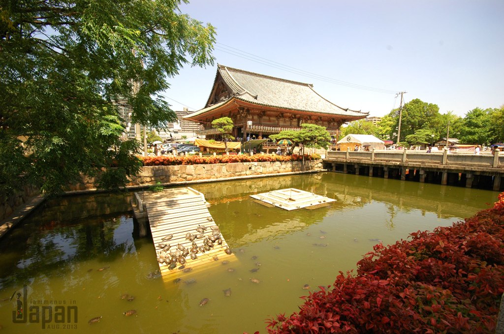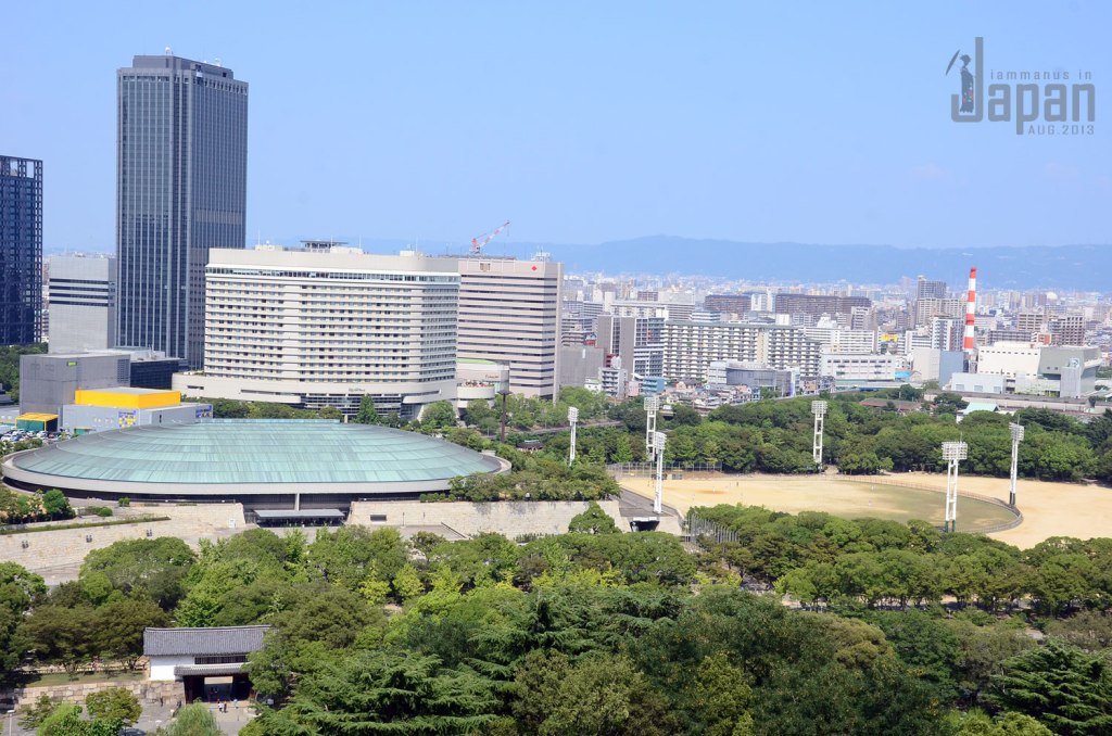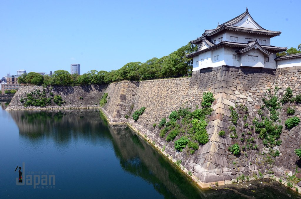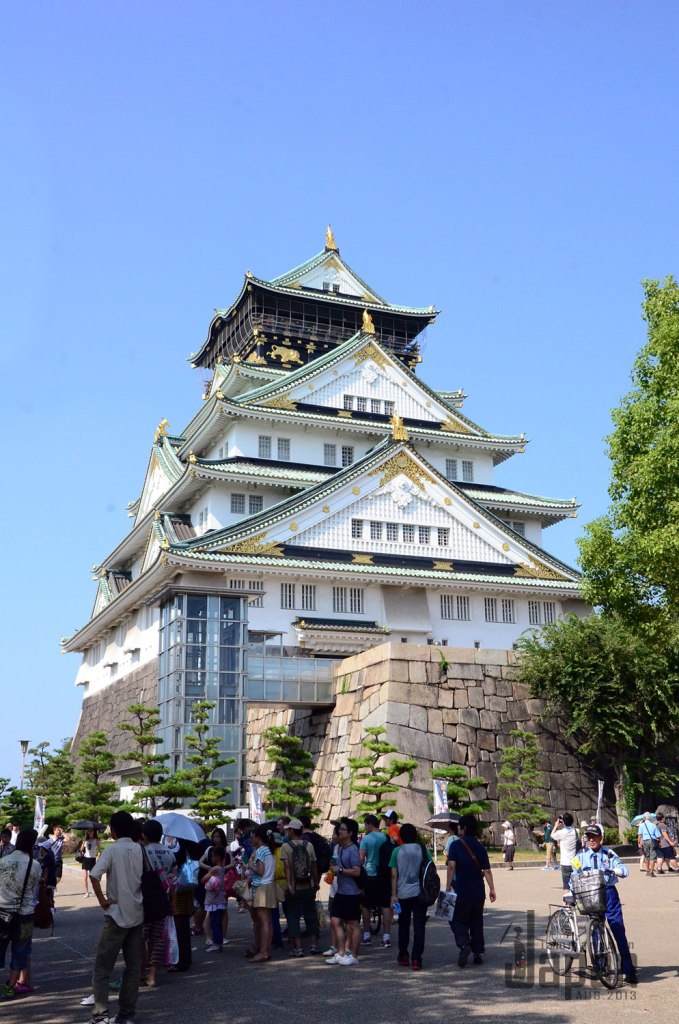 จากวัดเราไปต่อที่ปราสาทโอซาก้า (Osaka-jo) เราเลือกลงที่สถานี Tanimachi4chome มันเดินไกลมากกกกและร้อนมากกกก แถมหลงทิศอีก แต่ก็เดินไปจนเข้าเขตพระราชวังซึ่งเป็นกำแพงใหญ่ แต่เข้าไปแล้ววังเล็กนิดเดียวเองนะ มีร้านมาเปิดขายน้ำ ขายน้ำแข็งไส ในลานหน้าปราสาทด้วย คนเดินกินน้ำแข็งไสกันเหมือนภาพในหนังสือการ์ตูนเลย เลยจอดแวะกินบ้าง พักหายเหนื่อยก็ไปเข้าตัวปราสาทกัน ต่อแถวขึ้นลิฟต์ไปด้านบน ชั้นบนสุดเป็นระเบียงเดินชมวิวได้รอบๆ ลมร้อนพัดปะทะหน้าเหงื่อหายแต่หน้าแสบ! เดินเข้ามาชมด้านในมีจัดแสดงภาพเก่าๆ ของใช้เก่าๆ ชุดแต่งองค์ทรงเครื่อง ชุดเกราะต่างๆ เดินวนมาเรื่อยๆจนถึงชั้นล่าง ใครอยากเดินขึ้นก็ไม่ว่ากันไม่ต้องรอคิวขึ้นลิฟต์ด้วยนะ
