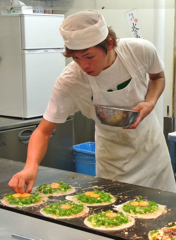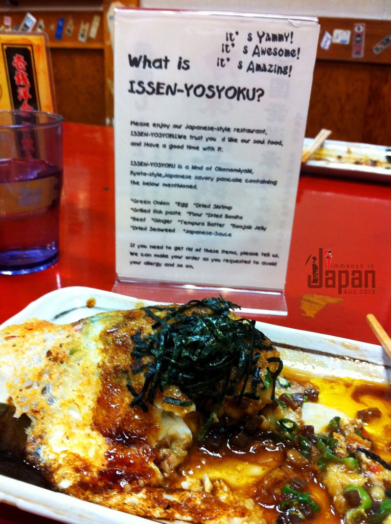 ด้วยว่าอาหารแพงทุกร้าน เราเลยเดินออกมาหาอะไรกินด้านนอก ดูแล้วไม่เจอร้านอะไรน่าสนใจเลยเข้าไปลองโอโคโนมิยะกิ เกียวโตสไตล์ ร้านนี้ขายเมนูเดียว ไม่ต้องสั่งนั่งแล้วบอกจำนวน แล้วรอๆ อิน้องคนขายคงมึน เอามาเสิร์ฟคนอื่นๆๆๆตลอด มาทีหลังได้ไปหมด จนต้องไปวีนเพราะหิวจัด สุดท้ายได้มาชิมก็อร่อยดีนะ รอดตายไปอีกมื้อ