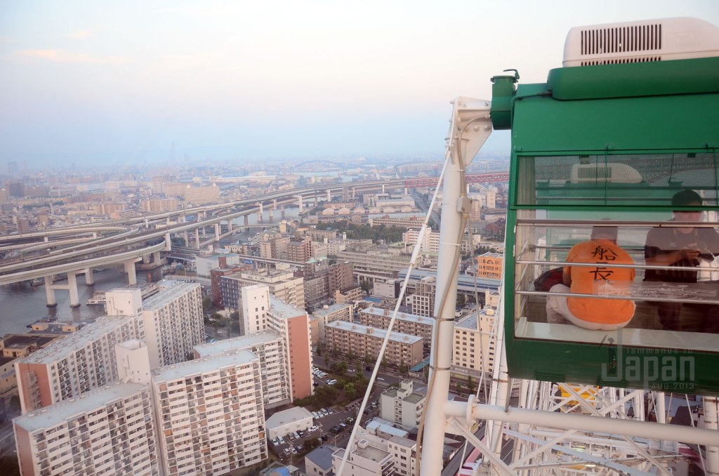 Tempozan Market Place ชั้นบนมีส่วนที่จำลองบรรยากาศญี่ปุ่นสมัยเก่า มีร้านขายอาหารด้วย แต่ก็ไม่ใหญ่มาก ยังไม่หิว อยากแค่นั่งพักกินกาแฟ แต่เชื่อมะ ทั้งห้างไม่มีร้านกาแฟน่านั่งเลย (ไม่เหมือนเมืองไทย มีห้างละ 10 ร้าน!) มีร้านขายขนมหวานน่านั่งที่สุด ก็คนเต็มเดินวนไปมา 2-3 รอบรอจังหวะกว่าจะได้นั่ง ขนมหวานก็พวกถั่วแดงนั่นแหละ กาแฟเย็นอร่อยที่สุดเท่าที่กินมาล่ะ แต่ก็หวานมันสู้บ้านเราไม่ได้ แต่ก็เอาวะ เลยนั่งพักเหนื่อยจนหายก็ออกไปดูมายากลที่เล่นเปิดหมวกอยู่ลานกลางแจ้งด้านนอก มองเห็นเรือ Santa maria วิ่งอยู่ลิบๆ อั๊ยยะ!นี่ 6 โมงกว่าล่ะนะ ยังวิ่งอยู่เลย เซ็งจริงๆ ใกล้พระอาทิตย์ตกดินแล้วเลยเดินไปขึ้นวงล้อสวรรค์ Ferris Wheel ใน Tempozan ชิงช้าสวรรค์อันนี้มันใหญ่มากมาย นั่งแล้วเสียวเล็กๆแต่โครงสร้างแข็งแรงดีไม่มีแกว่ง แอร์เย็นฉ่ำ นั่งดูพระอาทิตย์ตกดินบนชิงช้าสวรรค์มันแจ่มมากๆ ขอบอก
