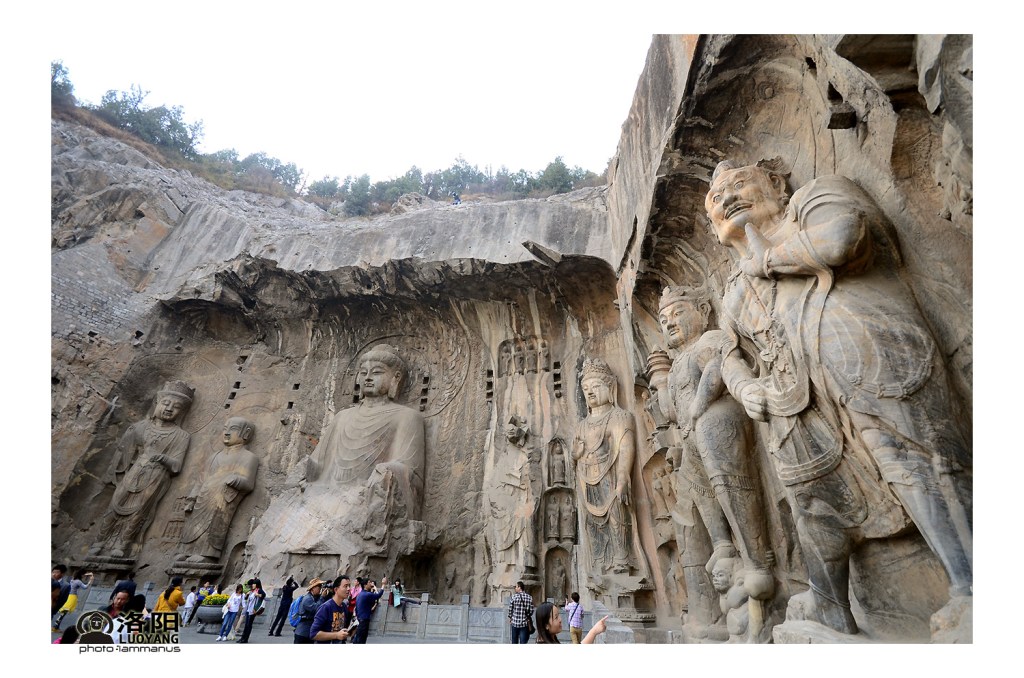 ที่ๆเรามานี่เรียกว่าถ้ำหลงเหมิน จุดเด่นคือภาพแกะสลักรูปพระพุทธรูป เป็นแบบนูนต่ำ เต็มหน้าผาไปทั้งแถบ แต่โดนทำลายไปเสียเยอะ ทั้งจากฝีมือคนและฝีมือธรรมชาติ เดินชมได้ทุกหน้าผาด้านขวามือ ขึ้นบันไดไม้ที่เค้าทำไว้ให้ไปดูภาพสลักดู เดินขึ้นๆลงๆจนเมื่อยก็สุดทาง จากนี้เราจะข้ามสะพานข้ามแม่น้ำไปฝั่งซ้าย มีการตรวจบัตรอีกรอบ บัตรที่ซื้อจะเป็นราคาเต็มเข้าได้ทุกที่ เข้าใจว่ามีราคถูกกว่านั้น อาจชมผาด้านขวาที่เราเดินดูมาเมื่อกี้ด้านเดียวแล้วเดินกลับก็ได้ แต่เราซื้อตั๋วแบบเต็มชุด ก็เดินข้ามสะพานมาได้ จากตรงนี้มีจักรยานให้เช่าขี่ด้วย ทั้งนั่งเดี่ยว นั่งคู่ นั่งสาม เห็นคนเช่าขี่เล่นกันสนุกดี แต่เราไม่อยากสนุกแต่ทุกข์ทีหลัง เพราะเดินไปเที่ยวที่ต่อไปต้องจอดรถไว้ด้านล่าง เดินขึ้นผาไปเที่ยวแล้วมันก็ลงอีกจุดหนึ่ง คงต้องเดินย้อนกลับมาเอารถตรงทางขึ้นอีก น่าจะเหนื่อยกว่าเดิม ทางขึ้นชมผาด้านนี้มีถ้ำและภาพสลักน้อยกว่า แต่พอเดินขึ้นแล้วหันกลับมาวิวสวยงามมาก มองเห็นผาด้านโน้นที่เราเดินชมมาแล้วเป็นภาพพาโนราม่า พร้อมแม่น้ำขวางอยู่ด้านหน้า สวยมากๆ