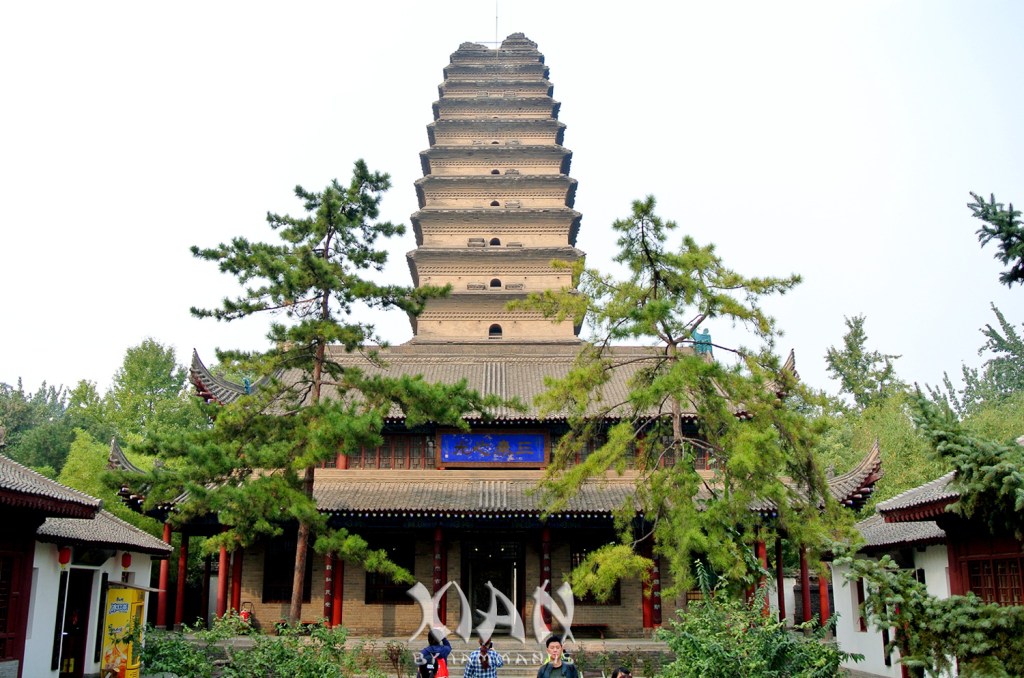 อิ่มแล้วกลับไปเก็บของที่รร. เช็คเอาท์เอาของลงมาฝากด้านล่าง มีเวลาอีกไม่เยอะ รีบไปวัดห่านป่าดีกว่า ตั้งต้นที่เดิม ใช้รถไฟสายสีแดง ไลน์ 2 ไปลง สถานี Nanshaomen (南稍门站) ออกจากสถานีแล้วมองหาป้าย วัดเจี้ยนฝู (荐福寺) เราจะไป เจดีย์ห่านป่าเล็ก – เสี่ยวเหยีนถะ (小雁塔) กัน เดินเข้าในซอยไปไม่ไกลจะมีที่เก็บค่าเข้าคนละ 30 หยวน เดินเข้าด้านในดูร่มรื่น สงบดีนักท่องเที่ยวไม่มาก ด้านในจะมีแผนผังเมืองเป็นเมืองย่อมๆเลย ประกอบด้วย หอกลอง หอระฆัง มีโบสถ์ มีเจดีย์ กำแพงล้อมรอบ สวนด้านในก็ร่มรื่น เจดีย์ห่านป่าเล็กเป็นชั้นๆหน้าตาเหมือนเจดีย์ที่เมืองต้าหลี่ เราเดินวนดูรอบๆไม่ถึงกับทั่วทั้งหมดเพราะพื้นที่ก็กว้างอยู่ ก็กลับออกมาทางเดิม