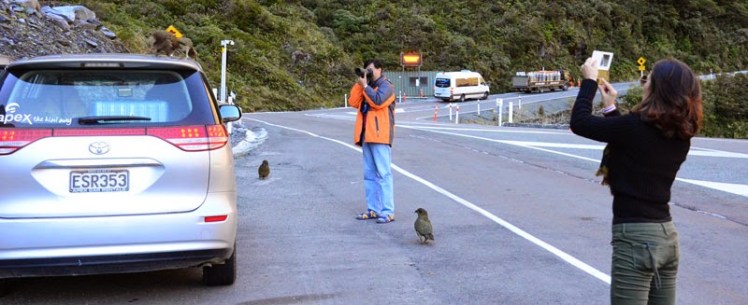 ขับออกมาเรื่อยๆ วิวสวยๆที่ไม่ได้จอดขามาก็แวะถ่ายรูปกันซะ ใครถ่ายก็ถ่ายไป ใครหิวก็คุ้ยขนมคุ้ยน้ำกินกันไป จนมาถึงทางเข้าอุโมง บ๊ะ! นก kea ที่เราตามหามาร่อนกันเต็มหน้าทางเข้าอุโมงเลย จัดแจงจอดเข้าข้างทาง ลงจากรถไปถ่ายรูปกัน สักพัก เริ่มรู้สึกตัวว่าอยู่ในวงล้อมนกแก้วมฤตยู เพราะนางมีจงอยปากที่น่ากลัวและนางไม่กลัวคน นางจ้องหน้า นางทำท่าจะจิกกล้อง เริ่มสยอง นางเริ่มเกาะหลังคารถ เอาจงอยปากจิกหลังคารถ กึ่กๆๆๆ สยองมาก รีบขึ้นรถดีกว่า รถคันอื่นเห็นก็จอดบ้าง แต่คงงงที่เห็นอินี่วิ่งหน้าตาตื่นขึ้นรถ เดี๋ยวก็รู้เหอๆๆ