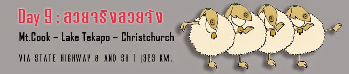 ออกมาถึง Highway สาย 8 เลี้ยวซ้ายมุ่งหน้า Lake Tekapo ทางสบายๆขับเรื่อยๆไม่มีเขาล่ะ วิวชนบทงามๆ เราไปถึง Lake Tekapo ตอนเที่ยงๆพอดี เลือกร้านเหมาะๆสักร้านกินกลางวันกัน วันนี้กินแกะกันเป็นหลัก มองวิวทะเลสาปไปด้วย เยี่ยมยอดจริงๆ