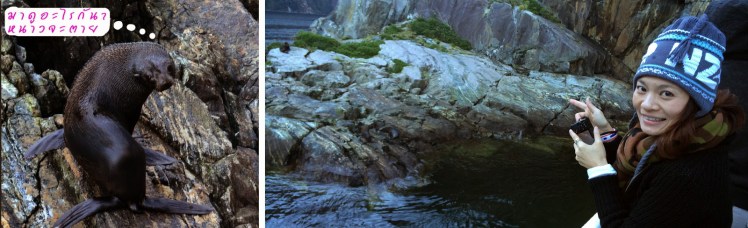จุดแรกที่เรือไปเทียบท่าคือ Milford Sound Discovery Centre (underwater observatory) ซึ่งเราไม่ได้ซื้อทัวร์นี้ไว้ ใครซื้อไว้ก็ลงไป แล้วเมื่อไหร่มีเรือมารับ เราก้ไม่รู้อ่ะ มีคนลงประมาณ 5-6 คน ส่วนมากคงแค่ล่องเรือชมวิวแบบเรา เรือพาชมวิว เลาะริมผาสูงชันไปเรื่อย บางจุดเป็นน้ำตกที่ตกมาจากหน้าผาสูง ลงมาเป็นฝอยเปียกปอนกันไปเลย จริงๆเค้ามีเสื้อกันฝนให้ใส่คลุมถ้าใครจะไปยืนที่ระเบียงเรือรับไอน้ำเปียกๆหนาวๆ แต่พวกเราเคยฟังอะไรบ้าง 5555 ดีว่าเสื้อหนาวพวกเราเป็นแบบมีฮู๊ดกันน้ำได้ เลยออกไปเริ่งร่ากันท้ายเรือ ให้หนาวๆสะใจ ฝรั่งเค้าใส่เสื้อกันฝนตัวยาวกัน ยืนหน้าเรือสวยๆ 55 อิ 4 คนนี่กรี๊ดๆอยู่ท้ายเรือเปียกๆหนาวๆ