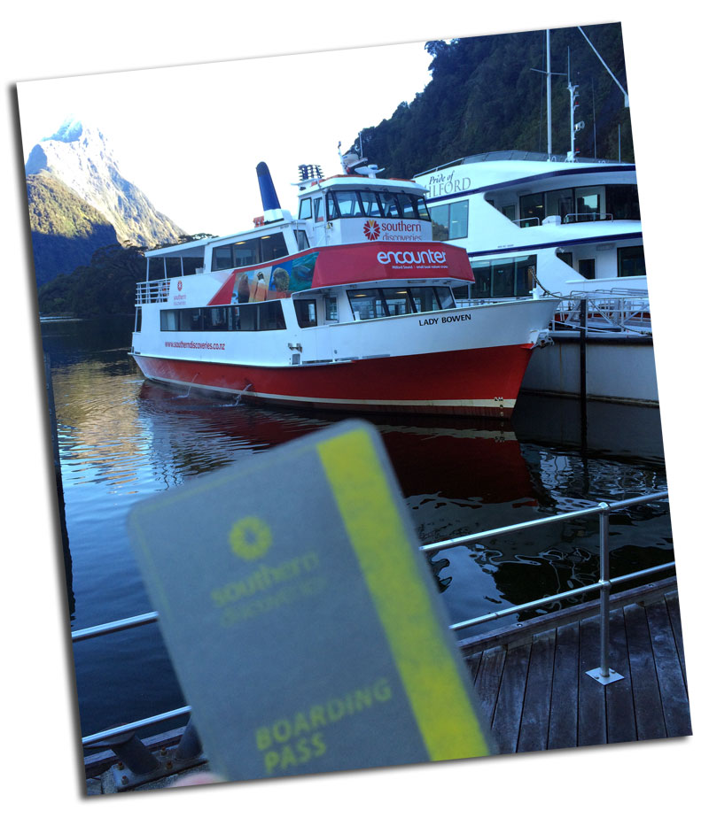 ทุกคนจอดรถที่ลานจอดแล้วก็เดินตามทางมีหลังคาไปที่ตึกสำนักงานริมท่าเรือ เข้าไปก็นำตั๋วจองไปขึ้น Boarding pass ที่เคาเตอร์บ.ใครบ.มัน มีอยู่ 3-4 เจ้า เรือเล็กเรือใหญ่เรือหรู รวมอาหารไม่รวมอาหาร ของเราเป็นบ.Southern Discovery จองมากับสนง.การท่องเที่ยว ได้เรือไม่ใหญ่นัก แต่ก็โอเคกระทัดรัดดี รอเวลาเรือออก ใครใคร่หาอะไรรองท้องก็หา มีร้านขายของเล็กๆมีตู้กดของกิน ไม่มีร้านอาหาร หรือมี? แต่ไม่เห็นนะ เดินวนๆไปริมท่าเรือถ่ายรูปกับเรือสำราญสวยๆพักเดียวก็ถึงเวลา ทุกคนต่างหาเรือตัวเองแล้วไปลงเรือกัน