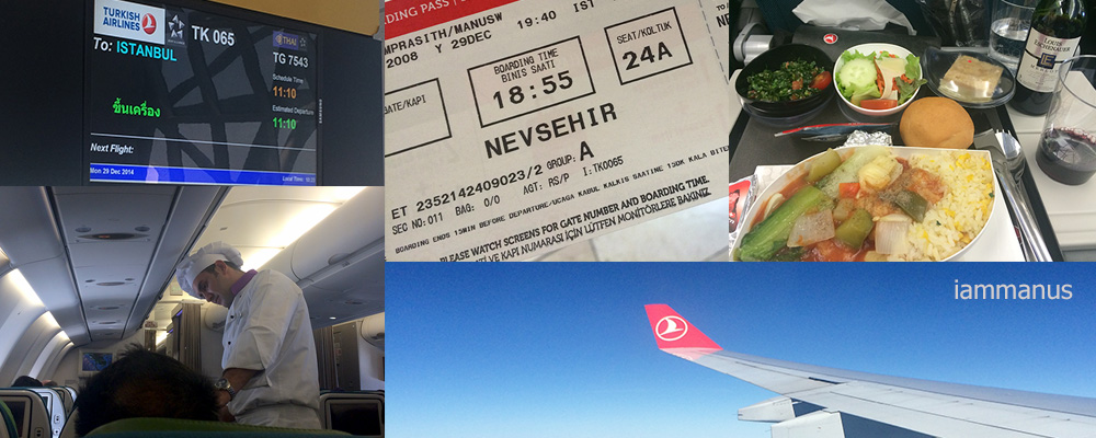 ใช้บริการ Turkish Airline สบายไปอย่างเพราะบินตรง ยาวๆไป 10 ชั่วโมง ขาไปเครื่องไม่เต็ม ถ้าจับจองที่ทันคงได้นอนยาว แต่เราช้ากว่าฝรั่งหัวทองว่ะ เลยอด แต่ที่นั่งก็ไม่แคบมากนะ หลับได้อยู่ เครื่องออกช่วงก่อนเที่ยงบ้านเรา บินตรงไปลงอิสตันบูล มีเสิร์ฟอาหาร 2 ช่วง อาหารว่างกับอาหารเย็น พอกินได้ ซัดปลากับไวน์ไปหลับสบาย Flight attendant ของ Turkish Airline พอเวลาเสิร์ฟอาหารนี่ได้ใจมาก ฮีใส่ชุดอย่างเชฟ บ๊ะ…ได้บรรยากาศมากๆ ชอบๆๆๆ กินแล้วนอนตื่นแล้วกินแล้วนอน 2 รอบถึงอิสตันบูลเป็นเวลาเย็นของตุรกีพอดี เพราะเวลาเค้าช้ากว่าบ้านเราประมาณ 5 ชั่วโมง