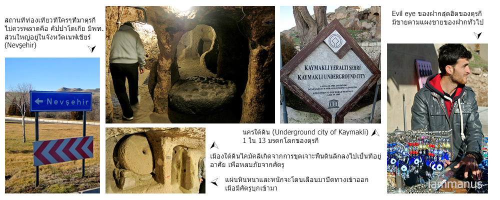 เช้านี้อากาศดีมากๆฟ้าใสเชียว ออกมาเริงร่าหน้าโรงแรมก่อนเลย นั่งรถออกจากโรงแรมสักครึ่งชม.ก็ถึงที่เที่ยวจุดแรก “นครใต้ดิน (Kaymakli)” ที่นี่ต้องมุดๆเข้าไปดู เป็นแหล่งหลบซ่อนตัวของชาวคริสเตียน เมื่อยามโดนรุกรานจากพวกกรีกโรมัน เลยขุดลงไปสร้างเมืองอยู่ใต้ดินเป็นเมืองใหญ่โตพอสมควร เค้าบอกมา แต่ที่เปิดให้เข้าไปชมรู้สึกจะมีแค่ 3 ชั้น มีห้องครบทุกอย่าง ห้องนอน ห้องอาหาร ห้องครัว ห้องนั่งเล่น ห้องหมัก-เก็บไวน์ แม้กระทั่งโบสถ์ คือว่าหลบศัตรูเข้ามาก็อยู่ได้ยาวเลย ถ้าศัตรูบุกก็มีการดีดหินมาปิดช่องทางเดิน ทำไว้ชนิดป้องกันสูงสุดกันเลย อันนี้แม่กะอามุดไม่ไหว ได้แต่เข้าไปชมห้องชั้นแรก จากนั้นมุดเข้าไปมันต้องก้มเยอะทีเดียว ทางเดินก็ยาวๆ 2 สว.เลยขอถอยหลังกลับออกไปชอปปิ้งด้านนอก (ถูกใจเลย) เรา 2 คนมุดตาม 2 ไกด์ไปเรื่อย ไม่นานก็วนกลับออกมา เจอ 2 สาวช็อปปิ้งกันอย่างเมามัน ของฝากที่นี่ราคารับได้ ถ้าซื้อเยอะก็ต่อราคาเอา เราก็เหมาพวง Evil Eye มา 10 กว่าอันๆละประมาณ 2 รีลา ก็ราวๆ30 กว่าบาท ถูกๆเหมามาก่อนเลย