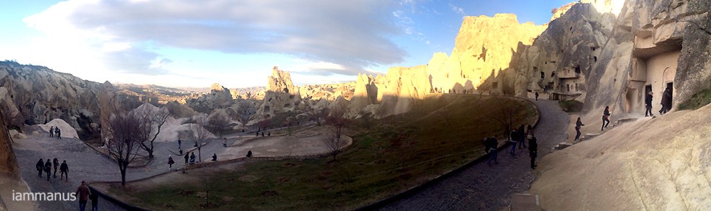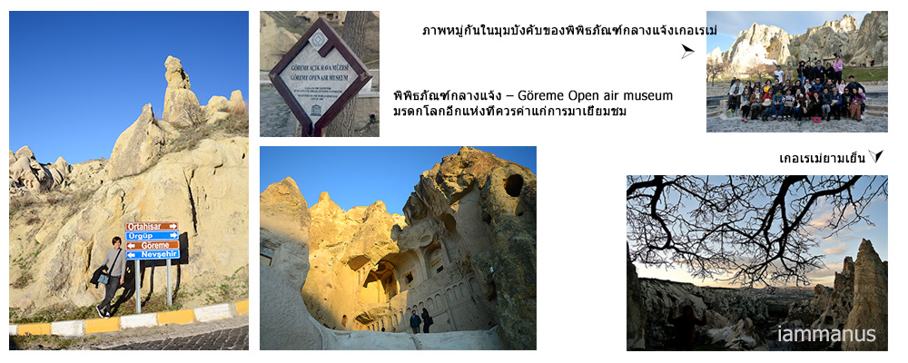 ช่วงบ่ายแก่ก็ไปแวะหมู่บ้าน เกอเรเม่ [Goreme] ก็เป็นหนึ่งในหมู่บ้านแถบหุบเขาแถบคัปปาโดเจียนี่แหละ ตรงที่เป็นแหล่งท่องเที่ยว เรียกกันว่า พิพิธภัณฑ์กลางแจ้ง – Goreme Open air museum – เพราะเป็นบริเวณที่มีการขุดเจาะหุบเขาทำเป็นโบสถ์คริสต์ เพื่อหลบการรุกรานของฝ่ายที่ต่อต้านศาสนาคริสต์ มันมีหลายโบสถ์อยู่ในบริเวณเดียวกัน เดินขึ้นไปชมได้หมด ใครขี้เกียจปีนก็เดินมาที่ลานด้านหน้าชมบรรยากาศรอบๆได้ แต่จริงๆมันไม่ได้ชันอะไรมากเลยนะ แต่ 2 สว.ก็ไม่ยอมเดิน เข้ามาได้นิดนึงก็ขอเดินกลับไปช็อปปิ้งแระ อัลไลกัน?