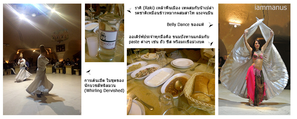 พอนักท่องเที่ยวกลุ่มอื่นๆเริ่มมาจนใกล้เต็ม ก็เริ่มมีการแสดง เริ่มด้วยการแสดงในชุดของนักบวช ลัทธิลมวน (Whirling Dervishes) โดยการหมุนเป็นวงกลมตามทำนองเพลง เรียกว่าเซมา (Zema) โดยมีที่มาจากการทำสมาธิผ่านทางดนตรี และการเต้นรำ ตามแนวความเชื่อของ ‘เมฟลานา’ (Mavlana) ผู้ถูกยกย่องว่าเป็นเจ้าแห่งลัทธิลมวน ซึ่งเป็นลัทธิหนึ่งในศาสนาอิสลาม วันต่อไปเราจะได้ไปเยี่ยมชมสุสานของท่านเมฟลานาด้วย ไว้ค่อยเล่าที่มาที่ไปของท่านอีกที หลังจากการเต้นเปิด Whirling Dervished แล้วก็มีเต้นๆระบำๆกันไปอีกหลายชุด สว.ทั้งหลายเริ่มง่วงแล้ว ไฮไลต์ของการแสดงก็ไม่มาสักที จนอิ่มเมนคอร์สกันไปแล้ว (อันเมนคอร์สนี่ขอบอกว่าผิดหวังไปตามๆกัน เพราะมีการให้เลือกว่า เอาปลา หรือแกะ หรือเนื้อวัว ทุกคนก็คาดหวังเสต็กอร่อยๆ พอมาเสิร์ฟมันก็เป็นข้าวกะเนื้อแบบหั่นๆมา อารมณ์ข้าวขาหมูที่เนื้อยุ่ยๆเละๆ มีปลาที่ดูดีหน่อยมาเป็นชิ้น) พอระบำหน้าท้องชุดท้ายออกมา ผู้คนค่อยฮือฮาตาสว่างหน่อย เธอเต้นเหมือนไม่มีกระดูกจริงๆแฮะ นักท่องเที่ยวจีน ญี่ปุ่น ดูหื่นมาก น่าขนลุก ไทยยังสงบเสงี่ยมวางมาดอยู่บ้าง จบโชว์ไฮไลต์ ก็หมดแรงกันทั้งคนเต้นคนดู กลับห้องสลบกันเถอะ..
