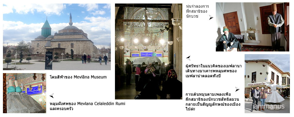 ออกเดินทางต่อ อีกสัก 1 ชม. ก็มาถึงเมืองคอนย่า เราจะแวะ Mevlâna Museum กันก่อนกินข้าว จากที่เล่าเรื่อง ลัทธิลมวน (Whirling Dervishes) ไว้ที่วันดูโชว์ วันนี้เรามาที่สำนักลมวนกันเลย ที่นี่คือสถานที่ๆฝังศพของ เมฟลาน่า อยู่รวมกับพ่อแม่ และลูกศิษย์ระดับอาจารย์หลายๆคน ผู้ที่นับถือและศรัทธาในคำสอนของเมฟลานา จะมาทำความเคารพหลุมฝังศพกันตลอดทุกๆวัน นักท่องเที่ยวก็เข้ามาเยี่ยมชมได้ โดยเฉพาะห้องด้านนอกรอบๆ ที่เคยเป็นที่พักที่ทำงาน ตอนนี้ได้ปรับเปลี่ยนเป็นห้องจำลองชีวิตของนักบวช ว่าเป็นอย่างไร มีรูปปั้นแสดงวิธีการฝึกสมาธิ มีห้องเก็บของ ตำรับตำราให้มาเดินดู ในโถงอาคารกลางที่มีโดมใหญ่สีฟ้าหม่นๆคือที่เก็บโลงศพของเมฟลาน่าและครอบครัว รวมทั้งพวกนักบวชชั้นสูงของที่นี่ ก่อนเข้าด้านในทุกคนต้องใส่ถุงหุ้มรองเท้าก่อนเข้า เพื่อจะได้ไม่ทำความเสียหายให้กับพื้นของโบสถ์ คุณนัทไกด์ของเราบอกว่าเมื่อก่อนด้านในถ่ายรูปไม่ได้ แต่อาเหม็ดบอกว่าตอนนี้ถ่ายได้แล้ว แต่ห้ามใช้แฟลช พวกเราเลยได้ภาพมาชมกันสบายๆ