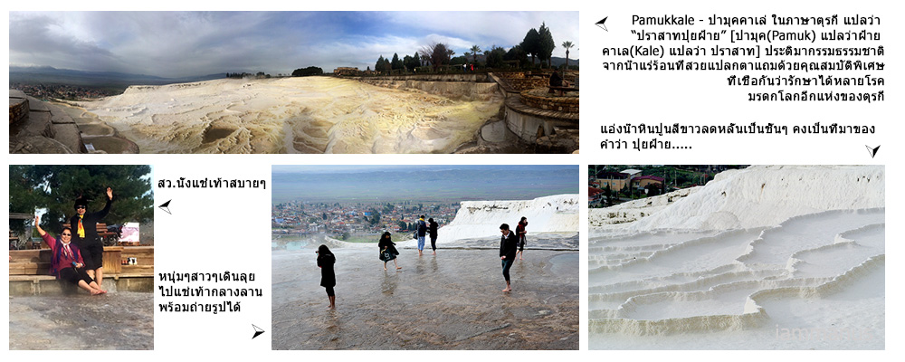 การเที่ยวก็เริ่มที่เดินไปที่น้ำตกปูนขาวก่อน (ตั้งเองนะเนี่ย) ชื่อทางการท่องเที่ยวเขาเรียกว่า ปราสาทปุยฝ้าย Pamukkale เริ่มต้นที่เดินไปถ่ายรูปมุมกว้างก่อน แสงแย่มาก ถ่ายมาไม่ได้ความสวยงามอะไรเลย จากนั้นก็เดินไปที่เนินด้านบนเพื่อ ถอดรองเท้าลงแช่เท้ากัน สว.ก็นั่งแช่ที่ขอบๆนั่นแหละ อย่าเดินไปไกลเพราะบางจุดมันลื่น พวกเราหนุ่มสาว (หรา…) ก็เดินลุยๆออกไปถ่ายรูปเล่นกัน ก่อนจะลงเดิน ก็ถอดถุงเท้ารองเท้าไว้ขอบทางลง แล้วก็ถอดเสื้อหนาวด้วยนะ เพราะไอร้อนมันขึ้น เดินเล่นอุ่นกำลังสบาย เดินเล่นจนเท้าเหี่ยว ก็ขึ้นมาเช็ดแข้งขา เพื่อออกเดินเที่ยวกันต่อ ตอนนี้ต่างคนต่างไปตามสภาพ สว.ก็เดินเล่นแถวๆนั้นกินขนม กินไอติมไปตามเรื่อง ส่วนเราก็เดินไปดูเมืองโบราณกัน
