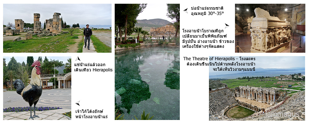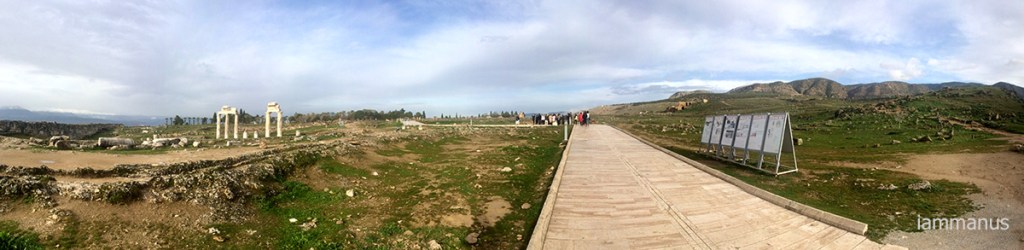 นั่งรถจากโรงแรมมาแค่ครึ่งชม.ก็ถึงแล้ว มีฝนลงบางๆให้เดินแล้วลื่นๆพอเสียวๆ มองรอบๆมันคือเวิ้งซากปรักหักพังที่ยังพอเห็นหลงเหลืออยู่บ้างของ เมืองโบราณเฮียราโปลิส (Hierapolis) ซึ่งเรายังคงงงยุคสมัยอยู่พอสมควร เพราะมองดูแล้วมันเป็นศิลปะแบบกรีก-โรมัน มีเสามีโถงหลังคาแบบนั้นเลย แต่พังราบไปเกือบหมด